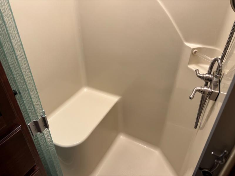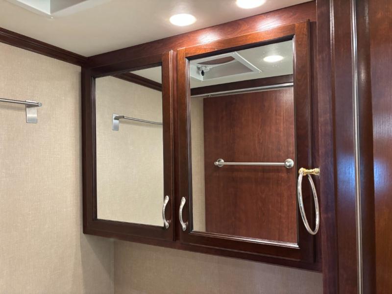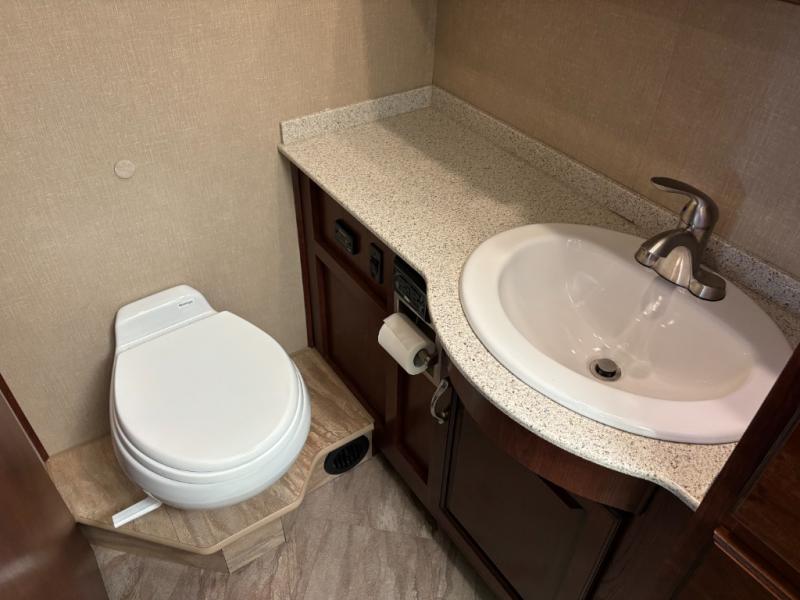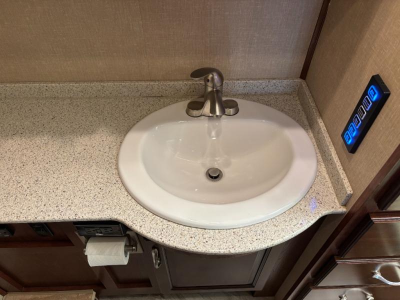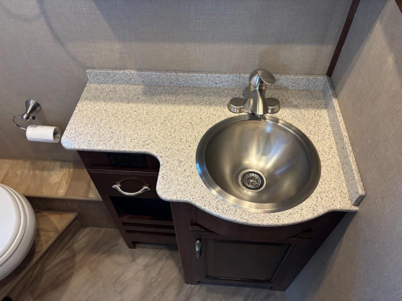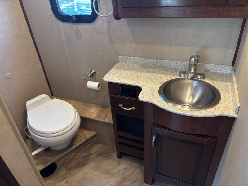 The mid-coach half bath provides a vanity with sink, toilet, and storage.
