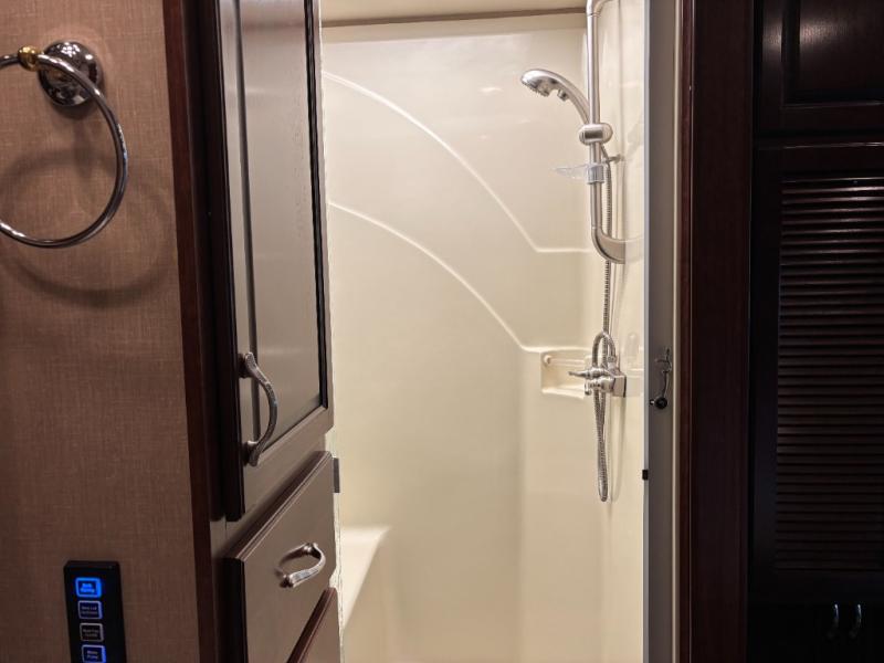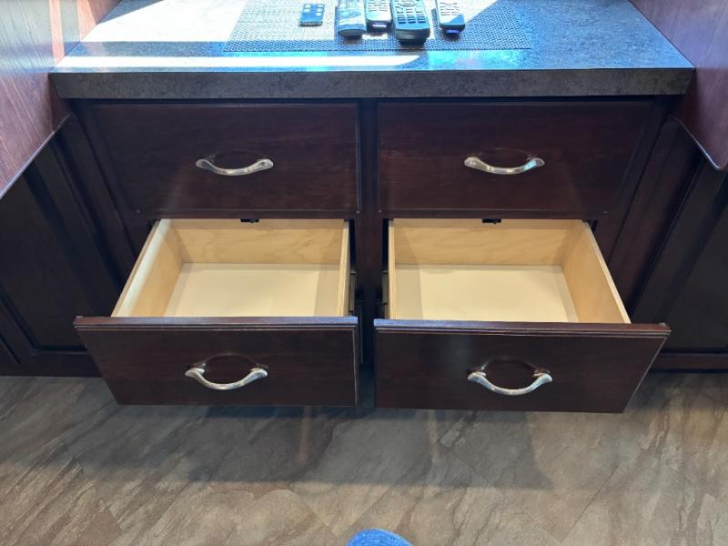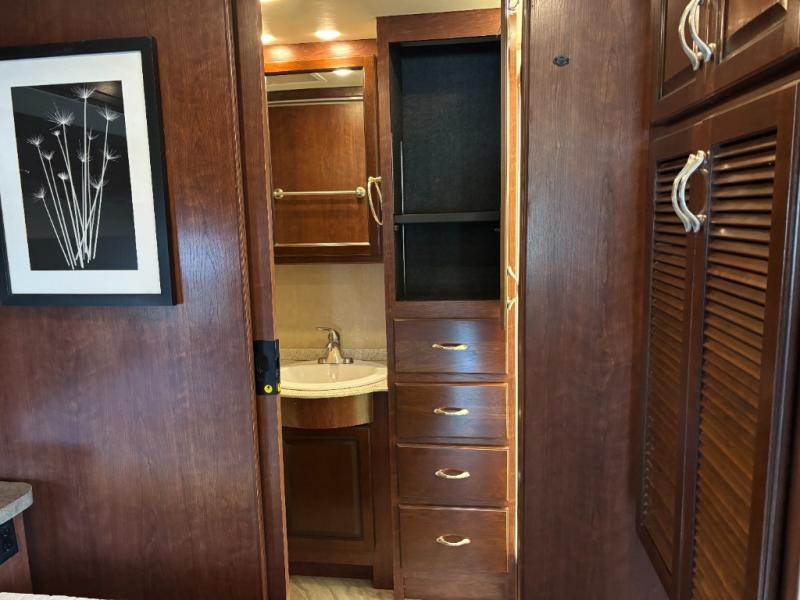 The very rear of this Bounder model 35K features a quiet retreat that includes a queen bed slide out with nightstands on both sides. Opposite a dresser with 32" LED TV and double wardrobes. The master bedroom also features an en-suite bath including a shower, linen storage, a toilet, and vanity with sink, plus overhead medicine cabinet, and more!