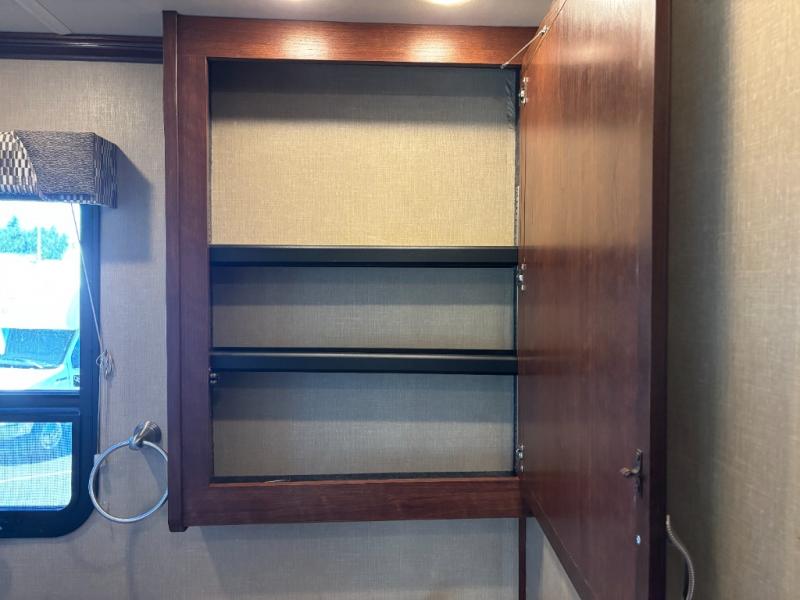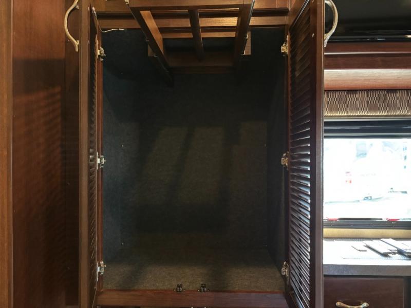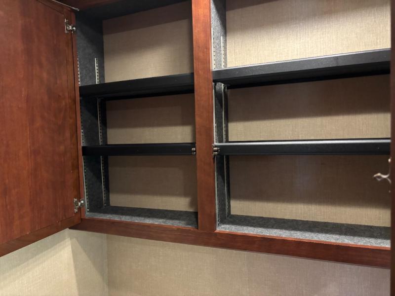 Step inside model 35K just behind the front passenger seat and notice the pedestal table that is handy when the captain's chairs are swiveled around. The large drivers side slide features a booth dinette with four sets of seat belts, a pantry, and an L-shaped sofa transformer that also has two more sets of safety belts for your rear seat travelers. You will also find overhead storage throughout this slide out.