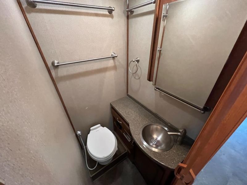 Opposite the kitchen along the curb side you will find the convenience of a full bath including a shower, toilet, and vanity with sink, plus a medicine cabinet.
