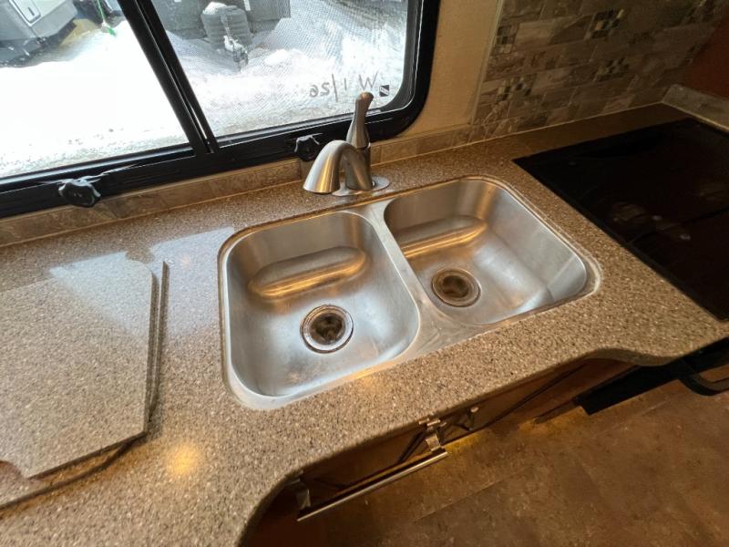 The kitchen area takes up the middle section of the road side full slide and provides you with everything you might need to cook up meals and snacks while you travel. You will love the residential refrigerator and three burner range with overhead microwave oven for cooking. There is also a counter area for prep space, a double sink, and ample storage for all of your dishes and things.