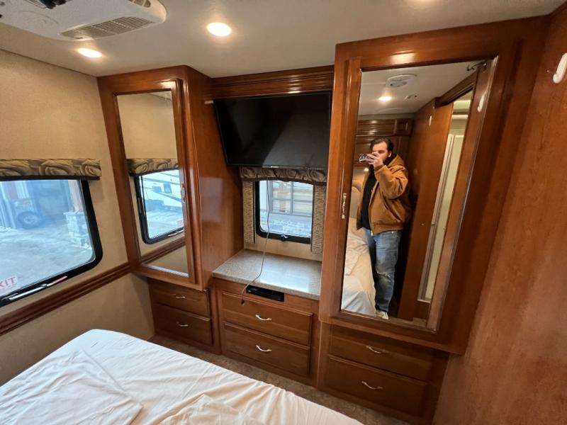 The rest of the coach makes up the rear master bedroom. This section can be closed off from the rest of the coach using sliding doors. Inside the space you have the end of the full slide out which features a dresser with two wardrobes for all of your storage. Along the curb side sleep comfortably on a king size bed with nightstands on either side. There is also a bit of overhead storage, plus more!