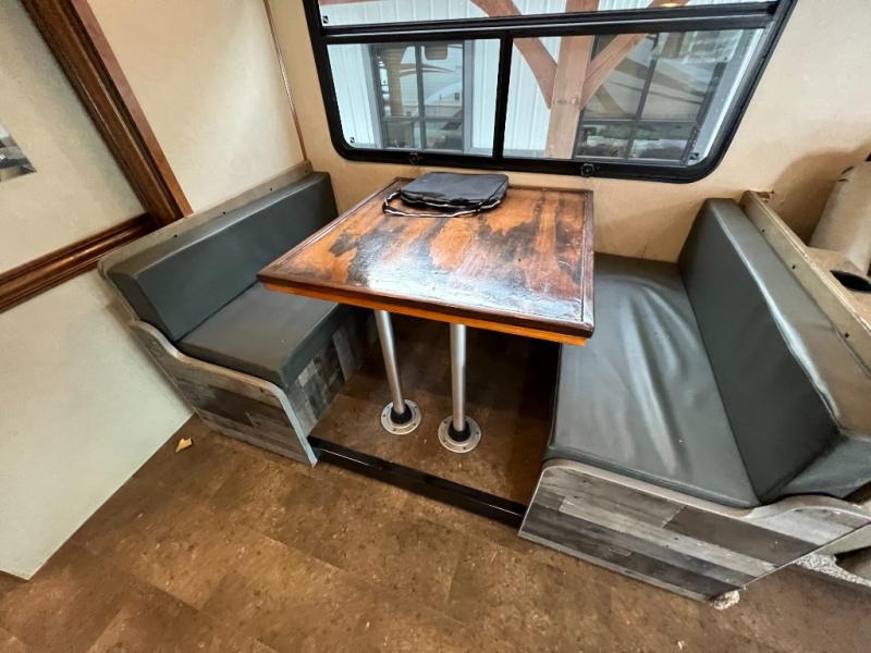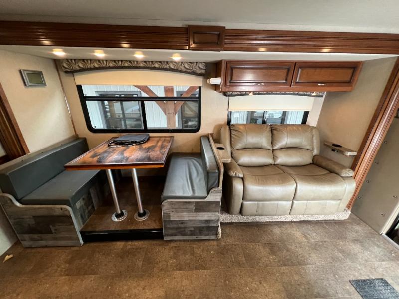 Step inside just behind the front passenger seat and take a look around. You will notice plenty of seating up front with an L-shaped booth dinette to your immediate left, and straight ahead a 62" jackknife sofa at the start of the full wall driver side slide. Each seating area can also be transformed into added sleeping space at night if needed, along with the cabover bed that is 42" x 80". There is also a 40" LED TV on a swing arm above the cab for multiple position viewing.