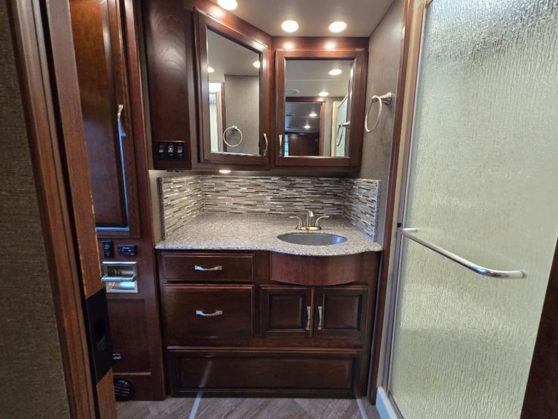 The very rear of this Pace Arrow model 36U is a full master bath including a toilet, shower, large vanity with sink, plus overhead storage. You will also find a wardrobe which provides plenty of room for towels and toiletries, plus more!
