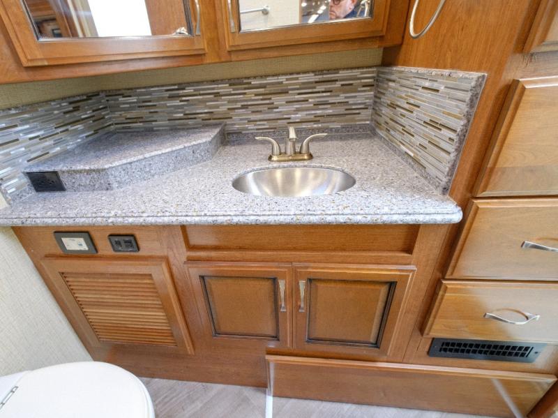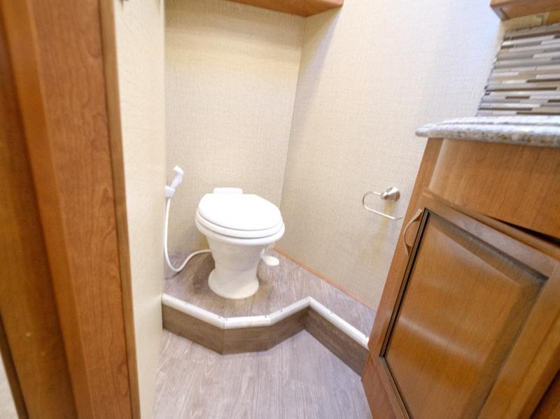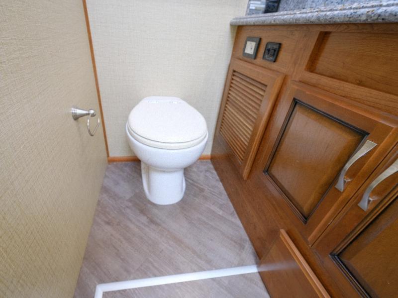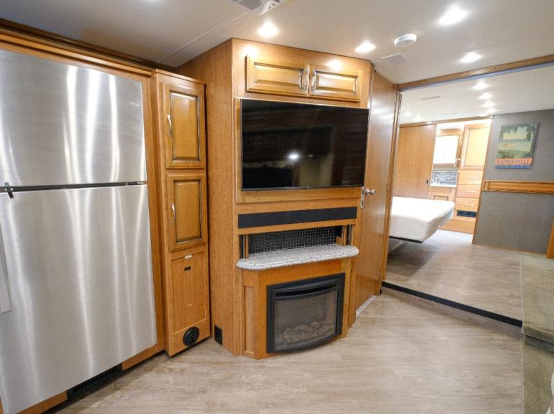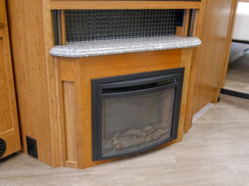 Mid coach you will find a convenient half bath with toilet and sink along the curb side. Just outside the bathroom door along the angled bath wall is a 43" LED TV and fireplace. The perfect addition for evenings when you just want to cozy up inside and enjoy a movie or relaxing time with a bit of ambiance that a fireplace provides. There is also a 32" LED TV over the cab area so you can watch in any direction.