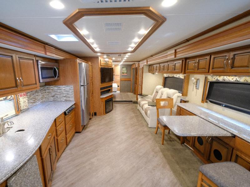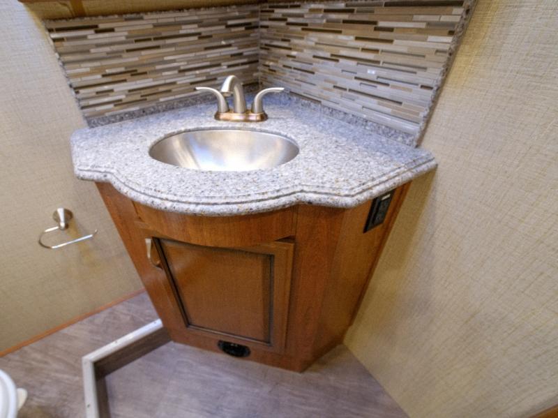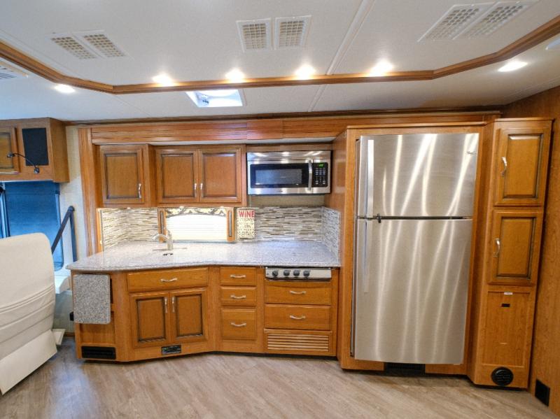 Step inside in front of the passenger side seat. The kitchen is directly behind and features a spacious kitchen sink with counter-top extension, a three burner range, overhead microwave oven, residential size refrigerator, and storage pantry for your dry and canned goods.