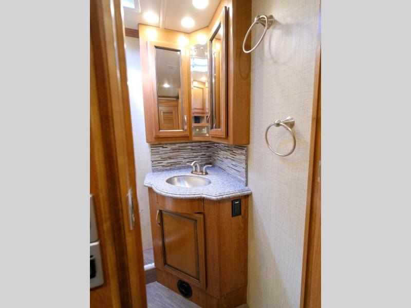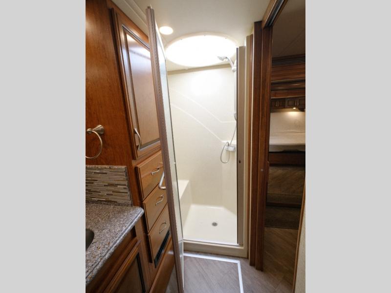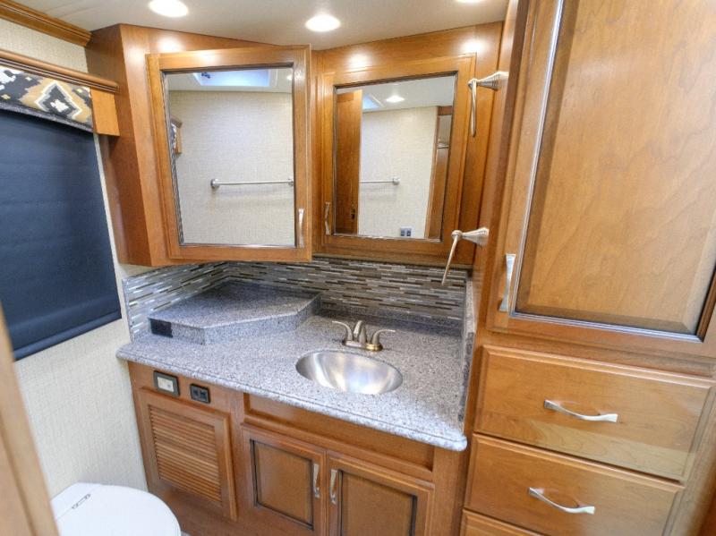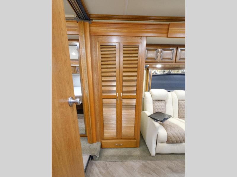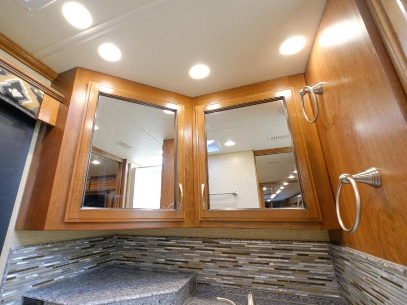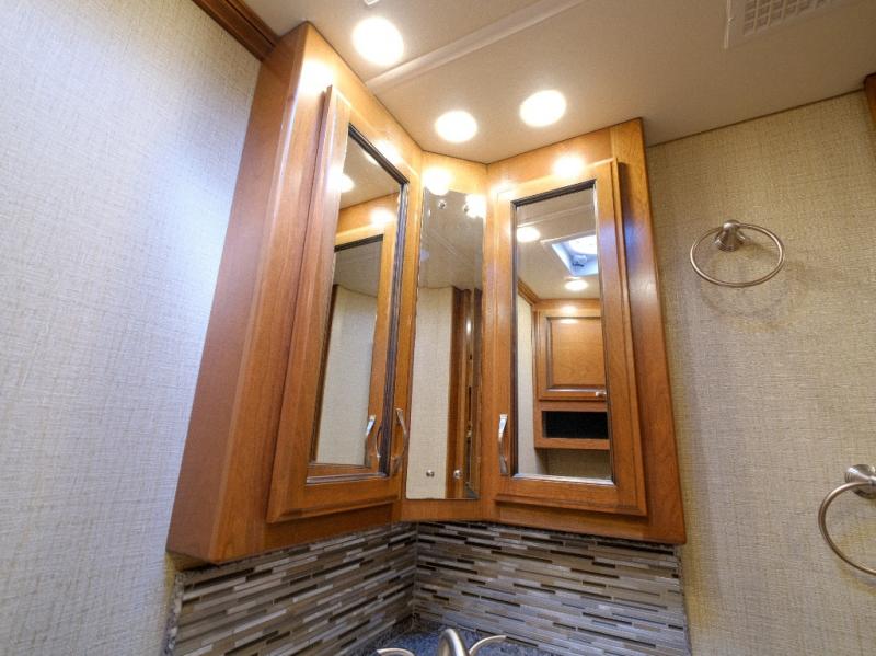 The master bath is at the rear of this diesel coach and features a shower with full seat and shelf, a linen cabinet, toilet, and vanity with sink, plus overhead storage, and more!