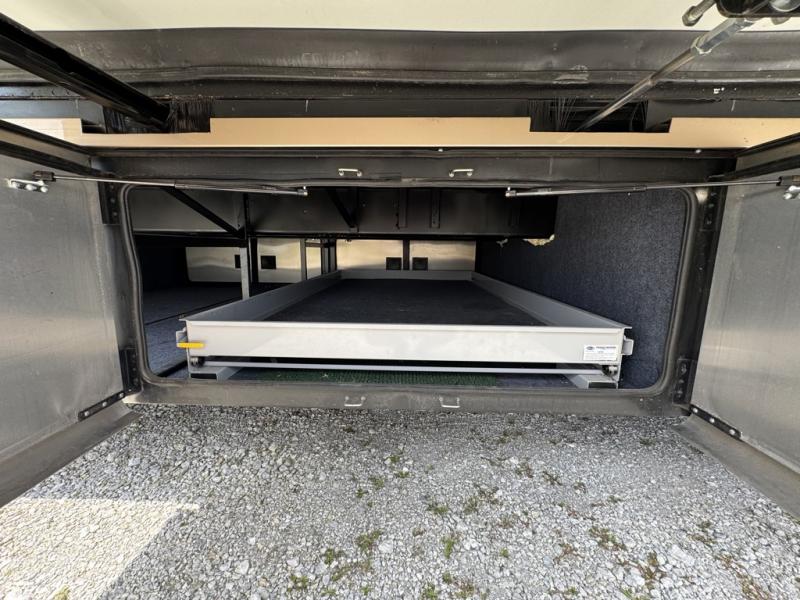 Opposite, along the driver's side there is a second slide out which really opens up the floor space. Here you will enjoy added seating with a booth dinette and sofa with a hide-a-bed, or you can choose an optional free standing dinette and hide-a-bed sofa or a sofa with a hide-a-bed and a dinette. Both feature overhead cabinets to keep things neatly tucked away and organized. Adjacent to the sofa, along the interior wall there is LED TV and fireplace.