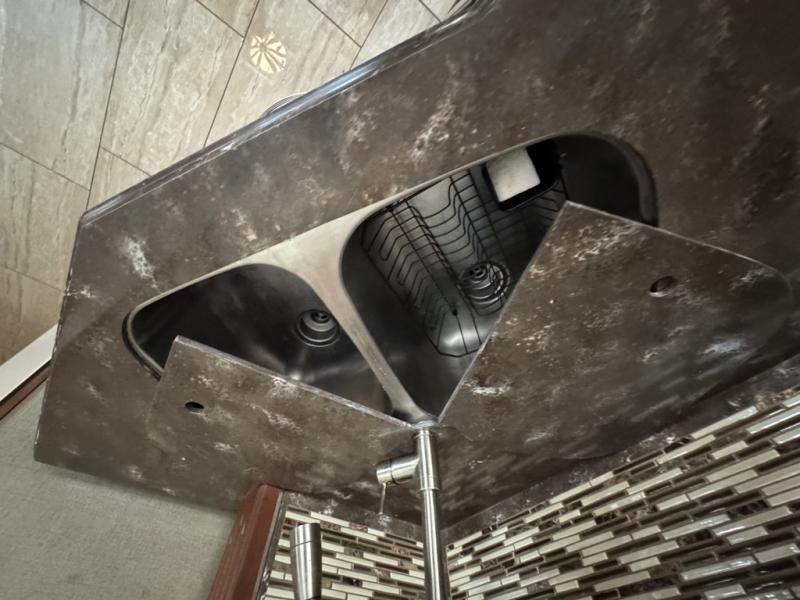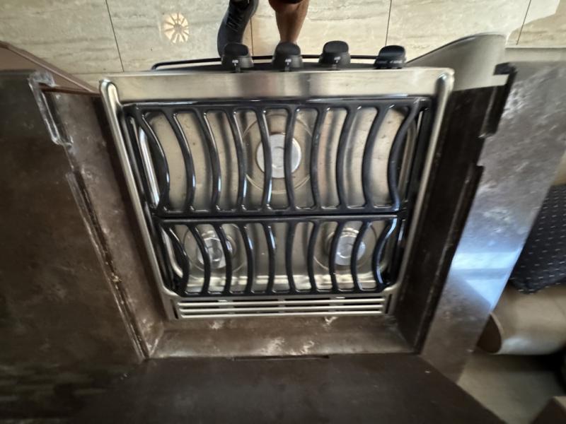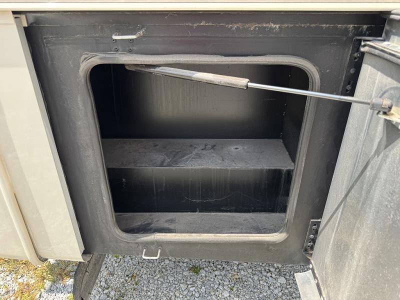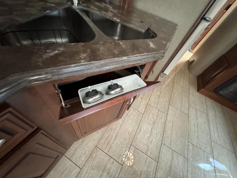 When you step inside and look back you will be amazed at the spaciousness you see. There is a slide out sofa with overhead cabinet, a two burner range, microwave, and double kitchen sink right behind the front passenger seat. A double door refrigerator finishes off the kitchen area just around the corner from the slide. You will also find a pantry for all of your dry and canned good storage needs.