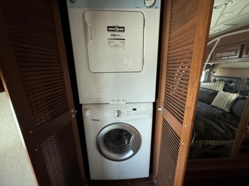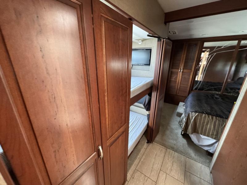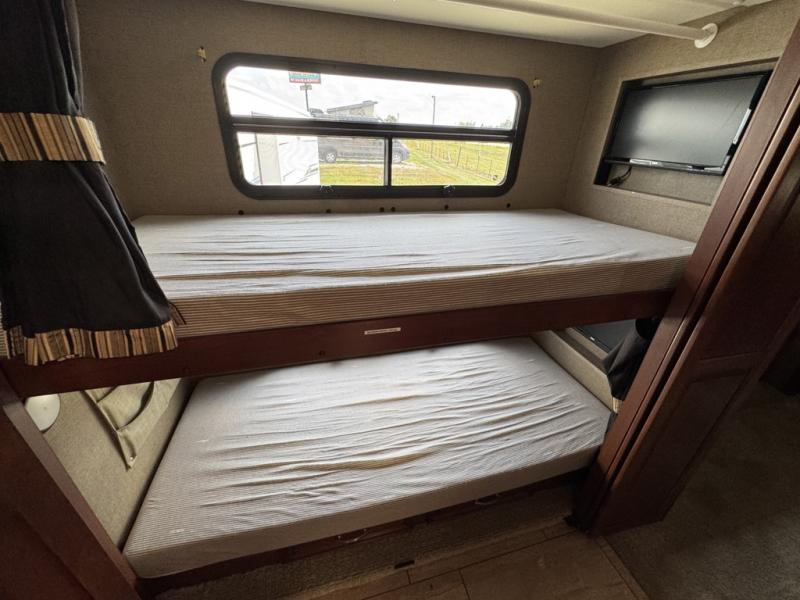Opposite the bathroom find a set of slide out bunks for the kids. They each feature flip down LED monitors. Also part of this slide out is the master bedroom chest of drawers and 32" LED TV. Opposite the chest of drawers find a queen size bed slide out including nightstands and an overhead storage cabinet. There is also a large rear wall wardrobe, plus a space that is prepped for a two piece washer/dryer.