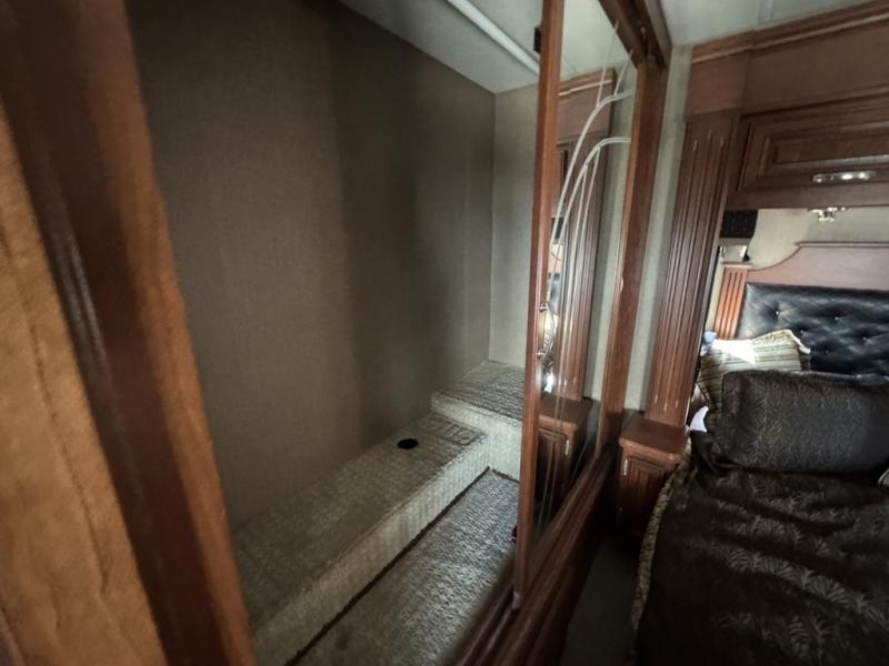 Continuing toward the rear of the coach you will pass a complete bath with corner shower, toilet, and sink, plus linen cabinet. The door is a sliding door which maximizes the hall space keeping it very open.
