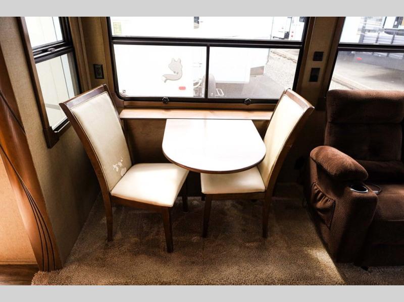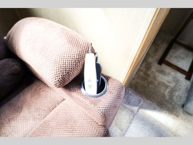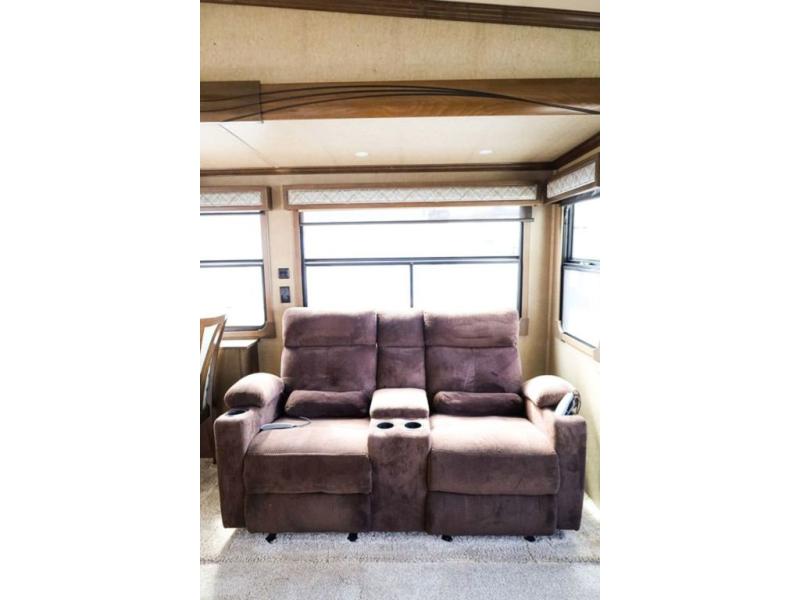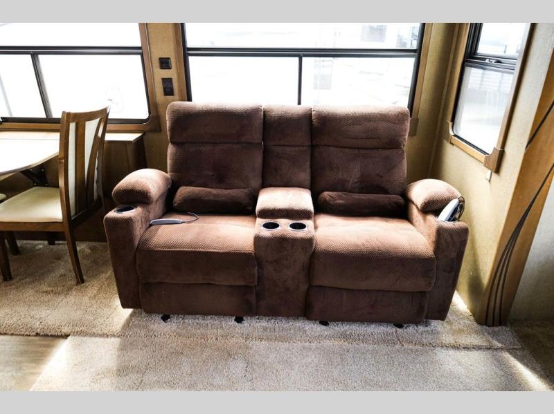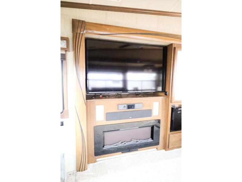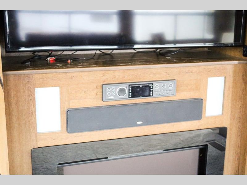 Step inside and notice the wide open living and kitchen area thanks to dual opposing slides. There is a free standing dinette with two chairs, and a theater seat for two with cup holders in the slide along the curb side front. You can opt. for two recliners in place of the theater seats if you wish. Along the rear wall you will find a sofa with storage cabinets above the entire width of the room. Adjacent to the sofa there is a slide out that features an entertainment center plus a cozy fireplace beneath to enjoy on those cooler nights when you want to just stay snugged up inside. This road side slide also features some of the kitchen appliances.