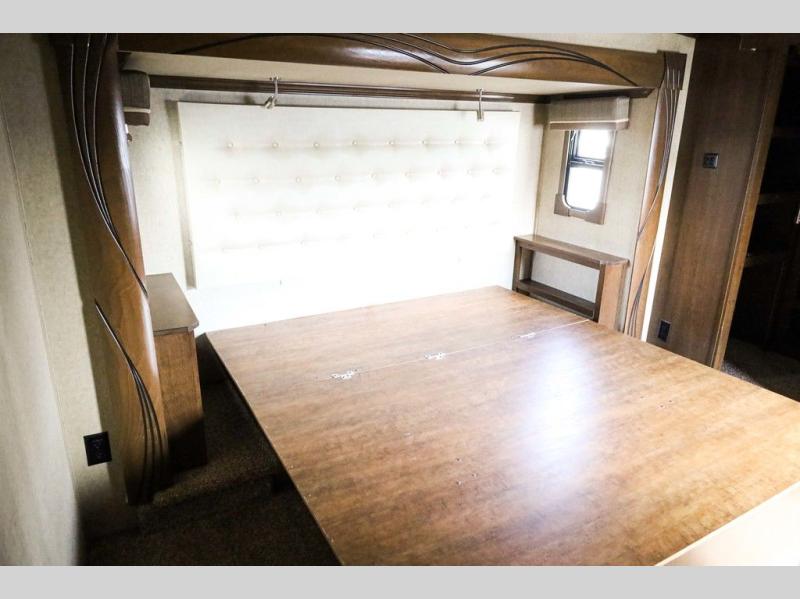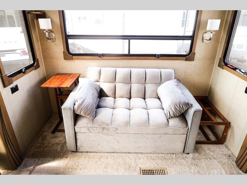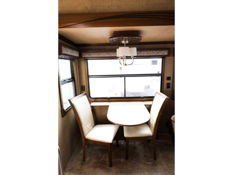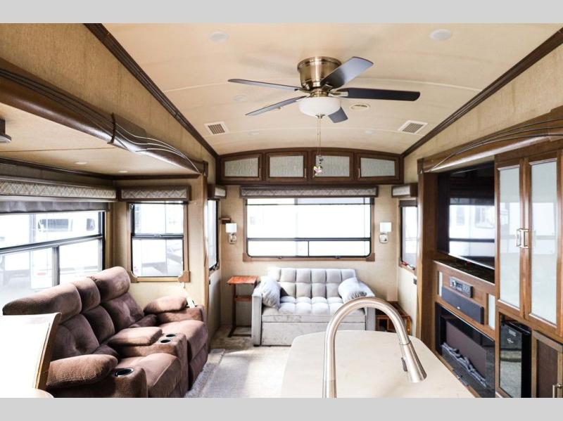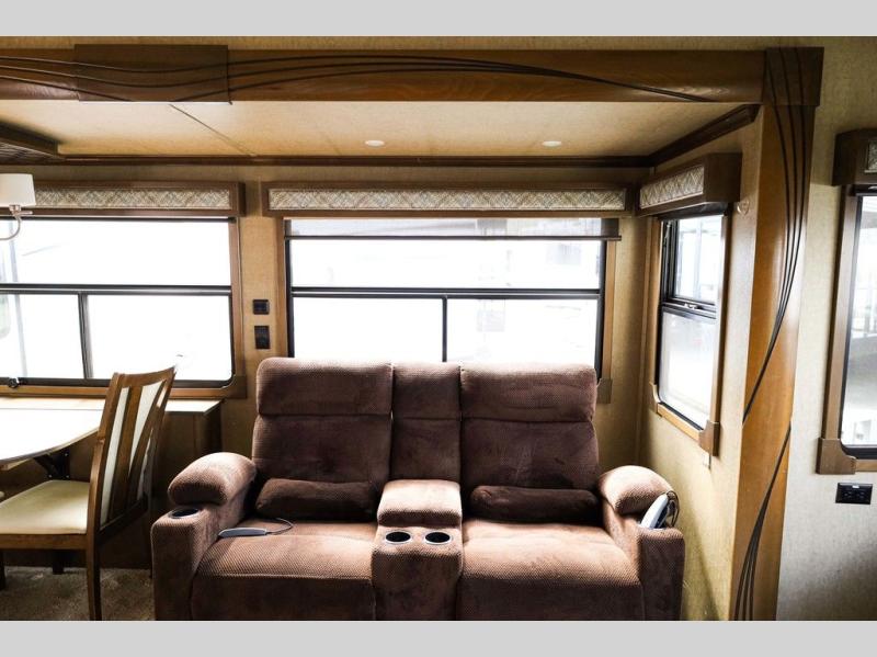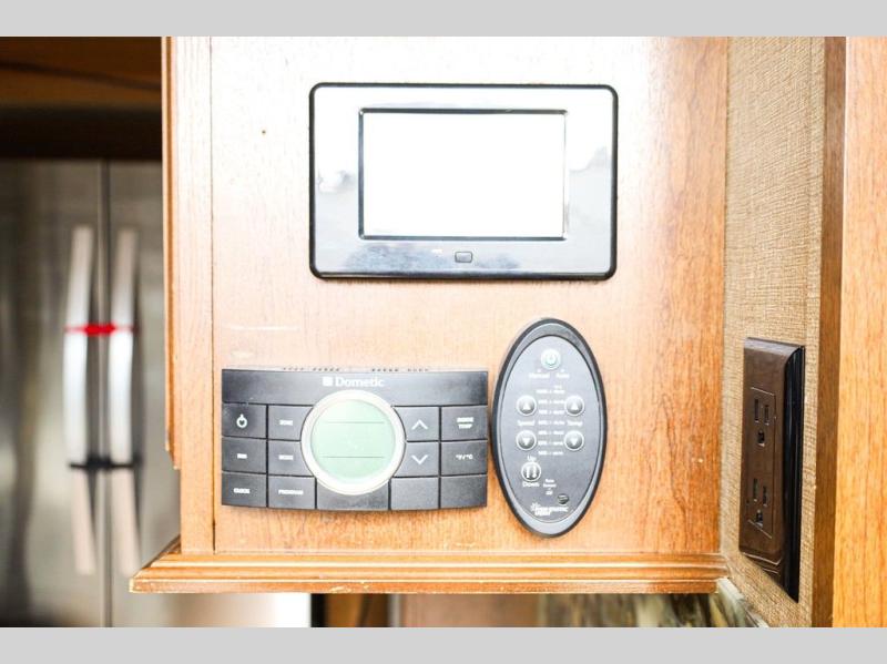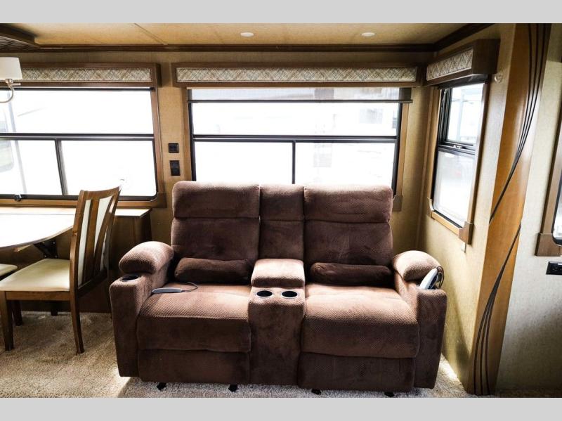 Step inside and notice the wide open living and kitchen area thanks to dual opposing slides. There is a free standing dinette with two chairs, and a theater seat for two with cup holders in the slide along the curb side front. You can opt. for two recliners in place of the theater seats if you wish. Along the rear wall you will find a sofa with storage cabinets above the entire width of the room. Adjacent to the sofa there is a slide out that features an entertainment center plus a cozy fireplace beneath to enjoy on those cooler nights when you want to just stay snugged up inside. This road side slide also features some of the kitchen appliances.