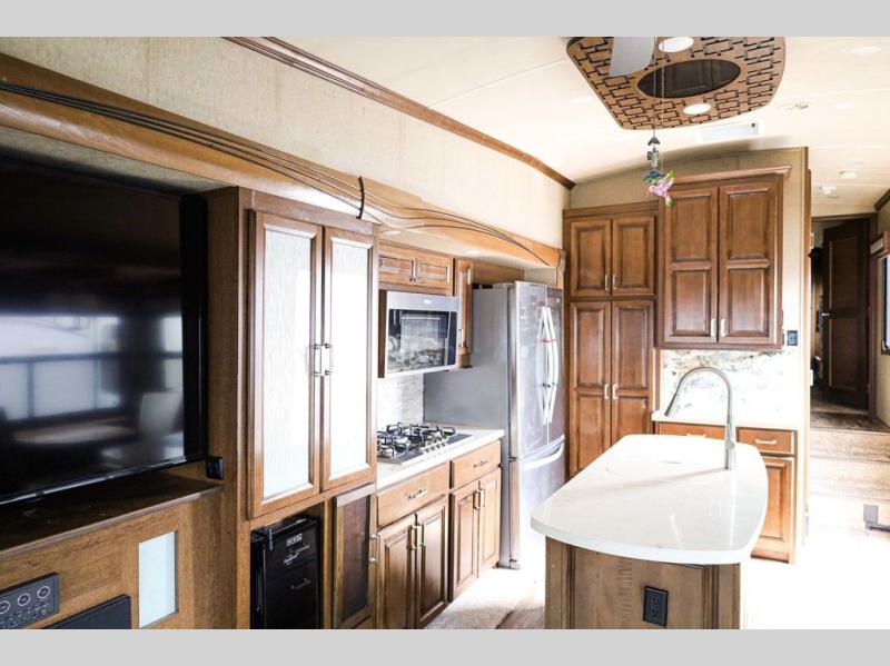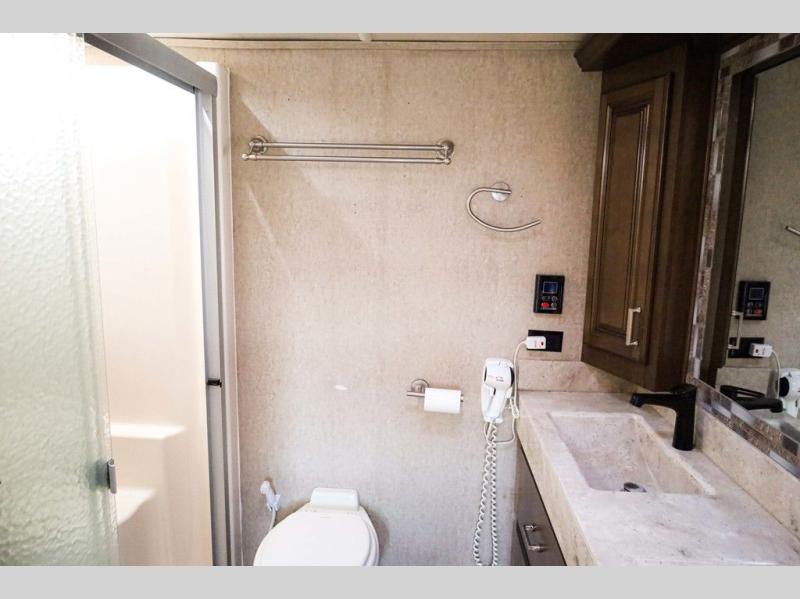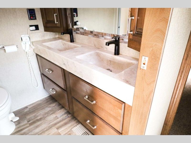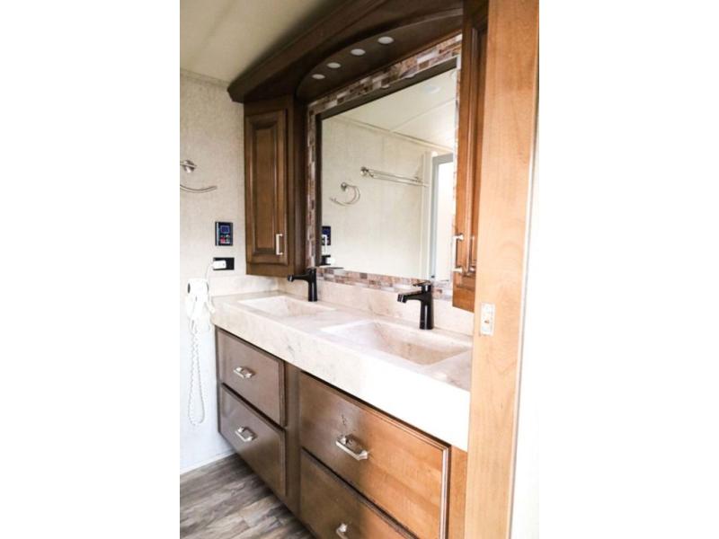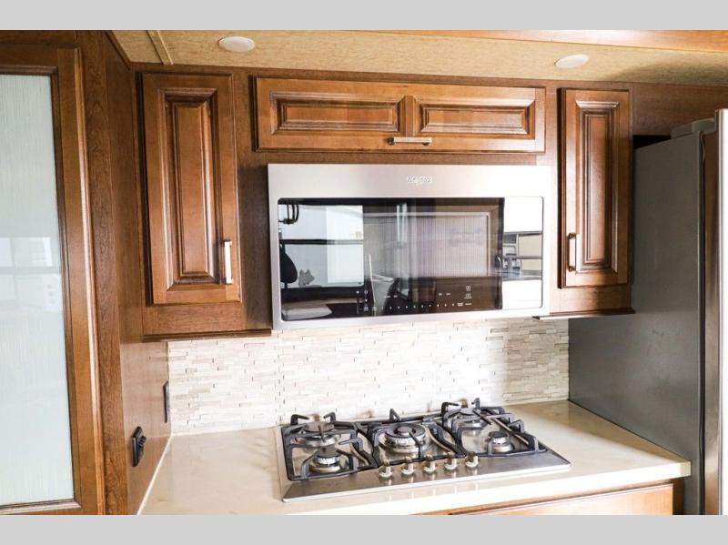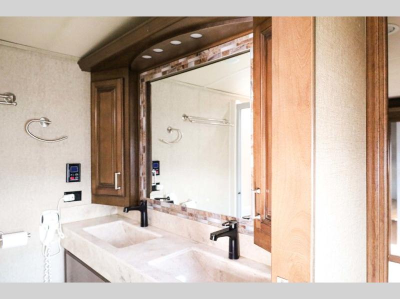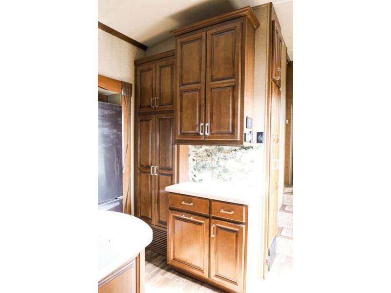 You will easily be able to cook up meals and snacks while you are away from home. There is a center island that features a double sink and counter space, plus you can add an optional dish washer as well. Along the interior wall find a pantry, plus more cabinetry and counter space. The refrigerator and stove top are found within the entertainment slide along the road side along with a convection microwave oven, more counter space, and a larger pantry for all of your dry and canned goods.