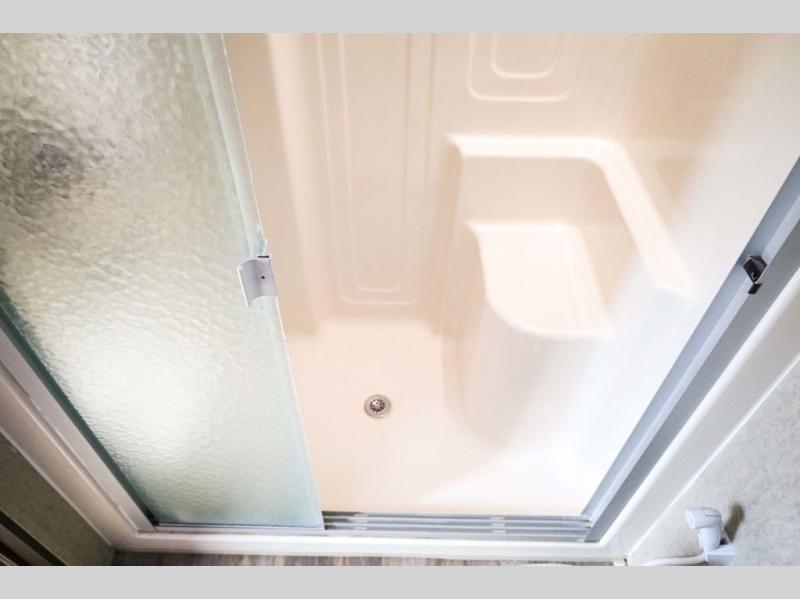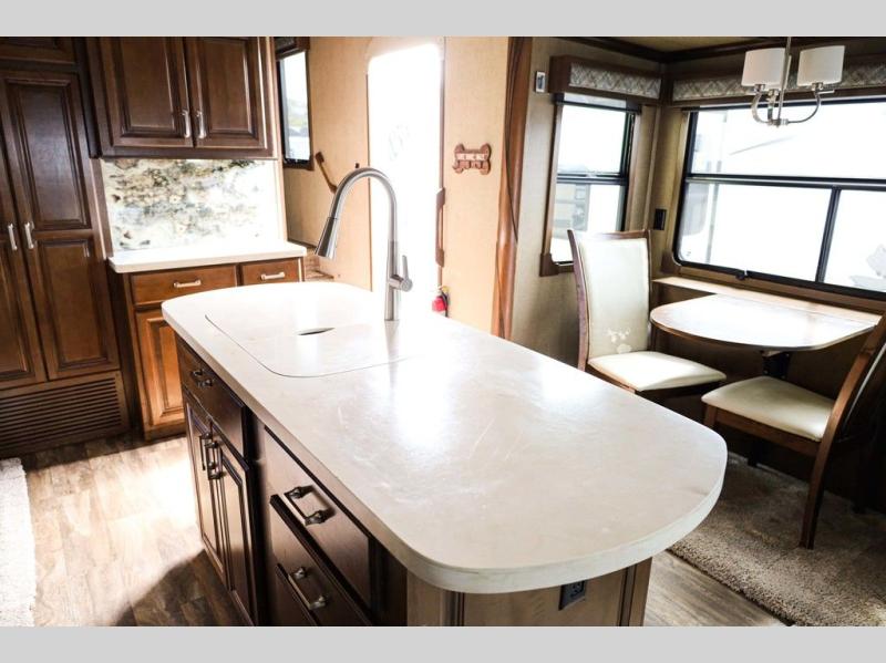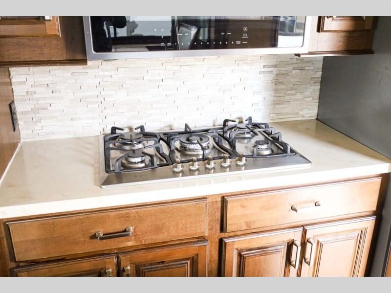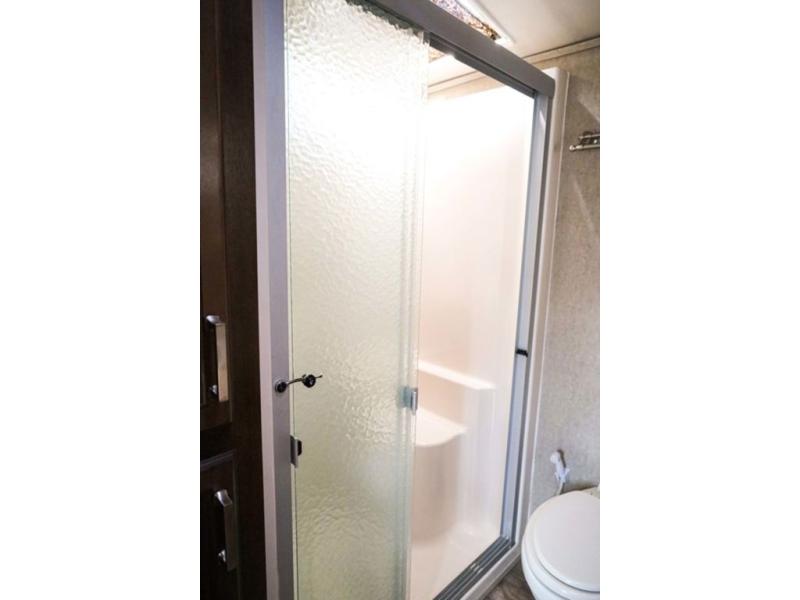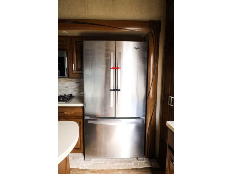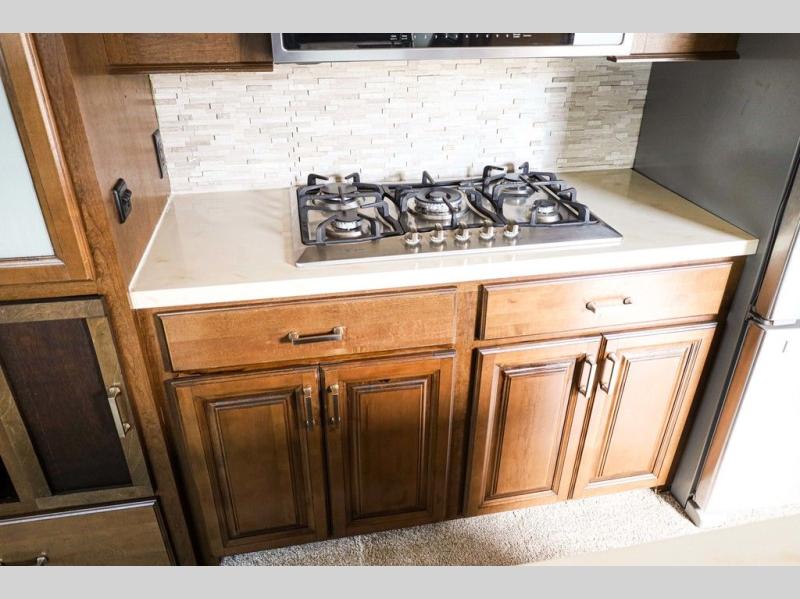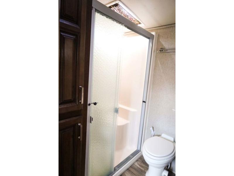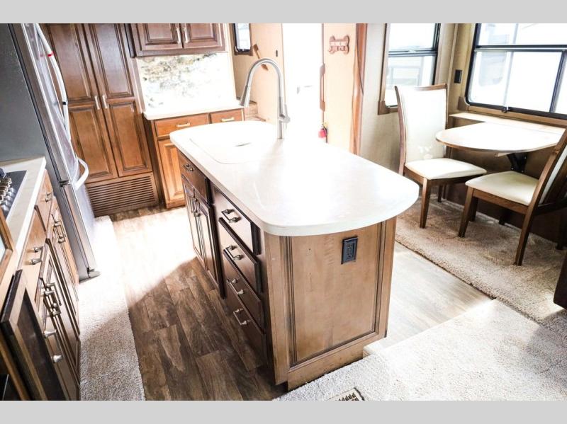 You will easily be able to cook up meals and snacks while you are away from home. There is a center island that features a double sink and counter space, plus you can add an optional dish washer as well. Along the interior wall find a pantry, plus more cabinetry and counter space. The refrigerator and stove top are found within the entertainment slide along the road side along with a convection microwave oven, more counter space, and a larger pantry for all of your dry and canned goods.