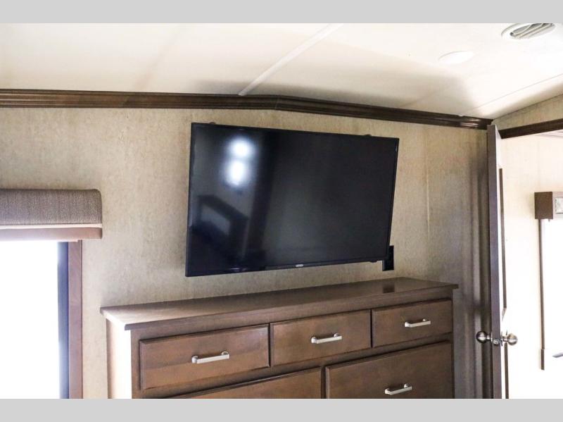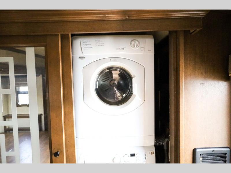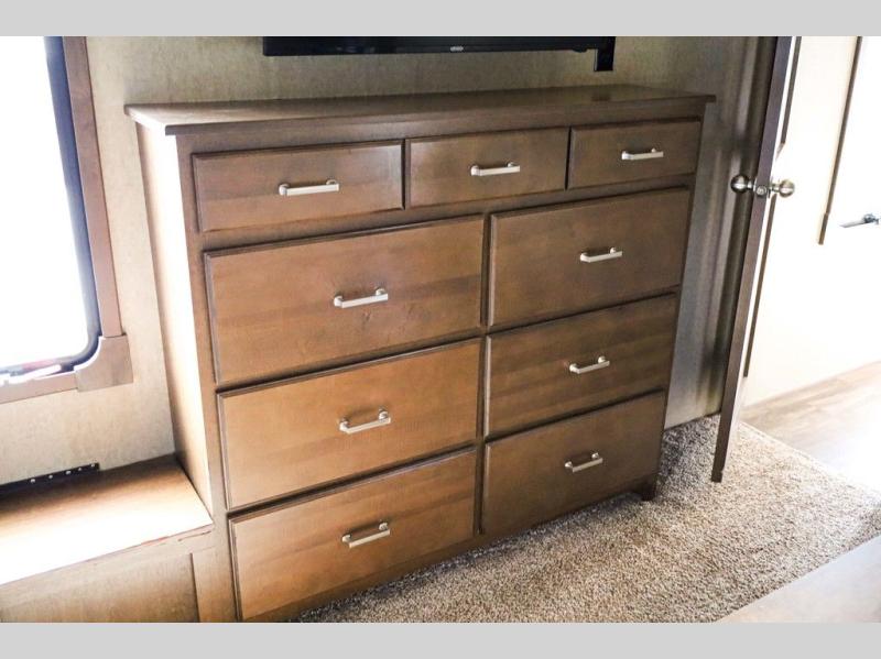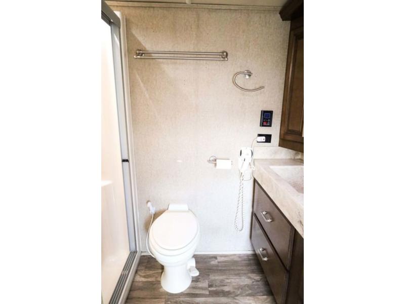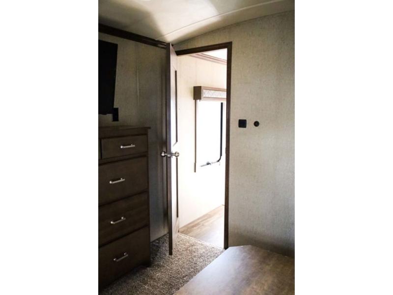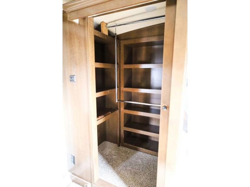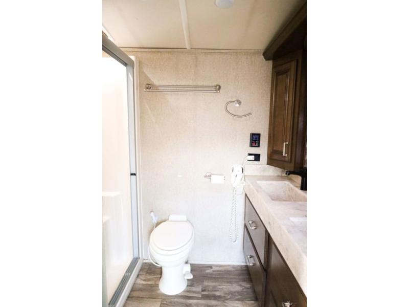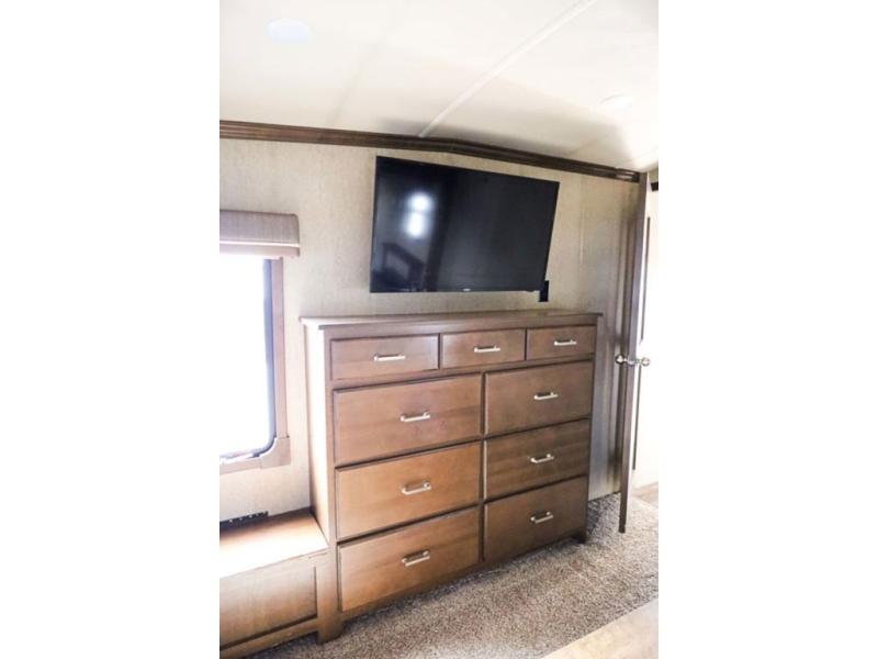 The door at the head of the hall in front leads into a spacious master bedroom. Here a slide out king or optional queen size bed provides added foot traffic space to move about. There are storage shelves on either side of the bed. Along the front wall a wardrobe with sliding doors that includes shelving inside. This space has also been prepped for a washer and dryer for added convenience. Opposite the bed along the curb side wall you will find a dresser with a TV overhead, and a bench with storage, plus so much more!