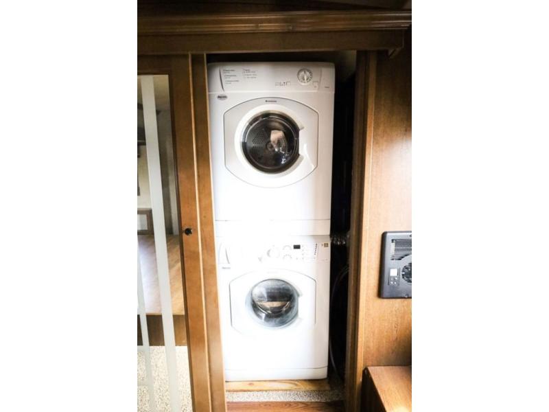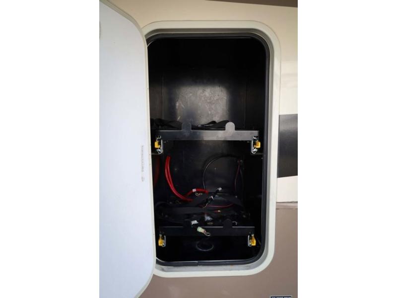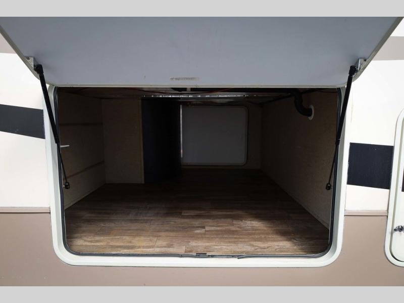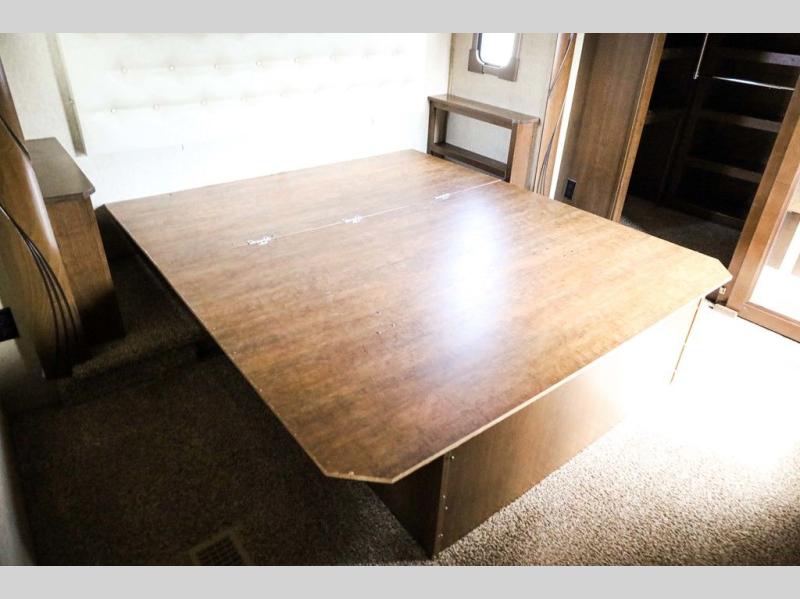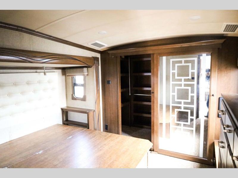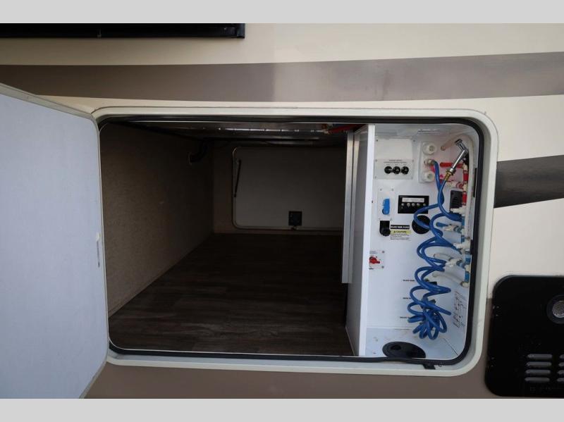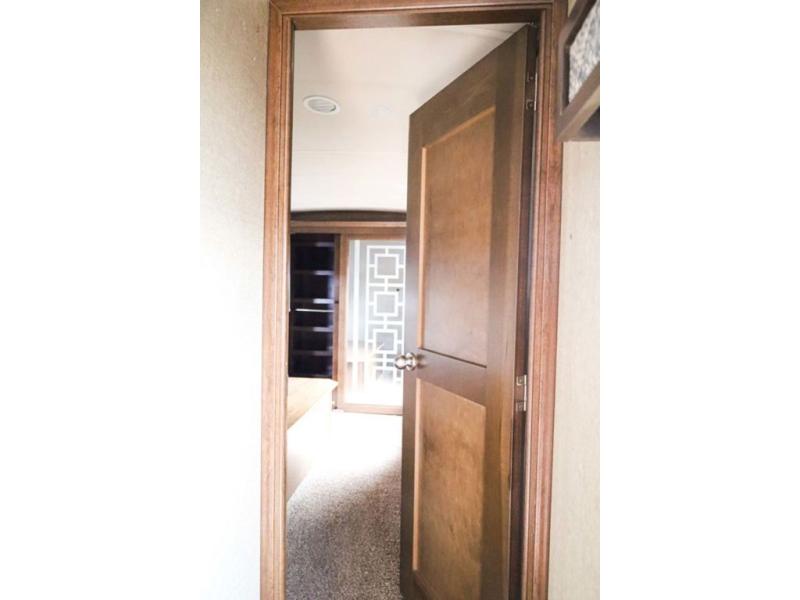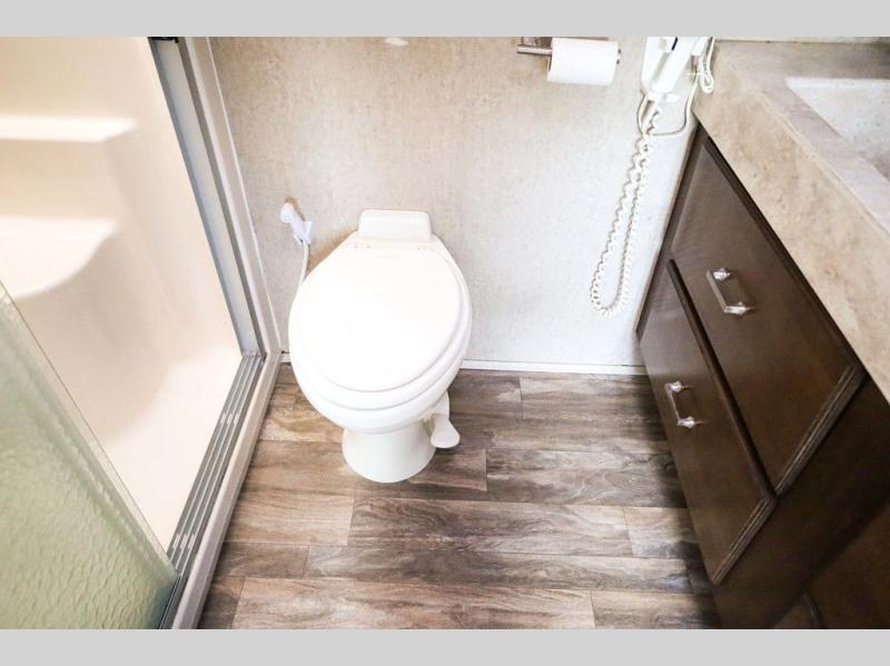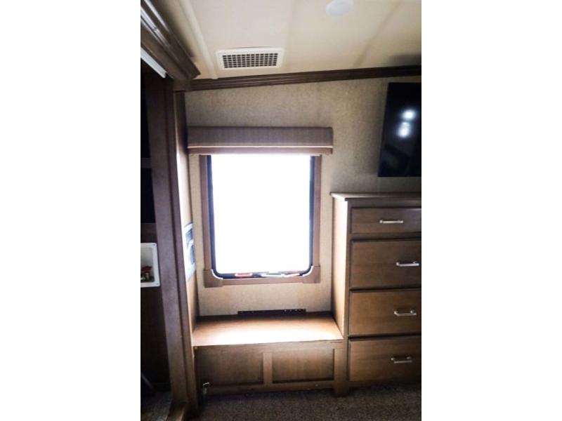 The door at the head of the hall in front leads into a spacious master bedroom. Here a slide out king or optional queen size bed provides added foot traffic space to move about. There are storage shelves on either side of the bed. Along the front wall a wardrobe with sliding doors that includes shelving inside. This space has also been prepped for a washer and dryer for added convenience. Opposite the bed along the curb side wall you will find a dresser with a TV overhead, and a bench with storage, plus so much more!