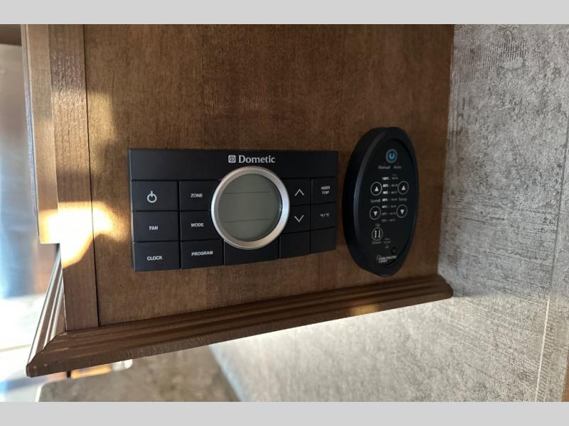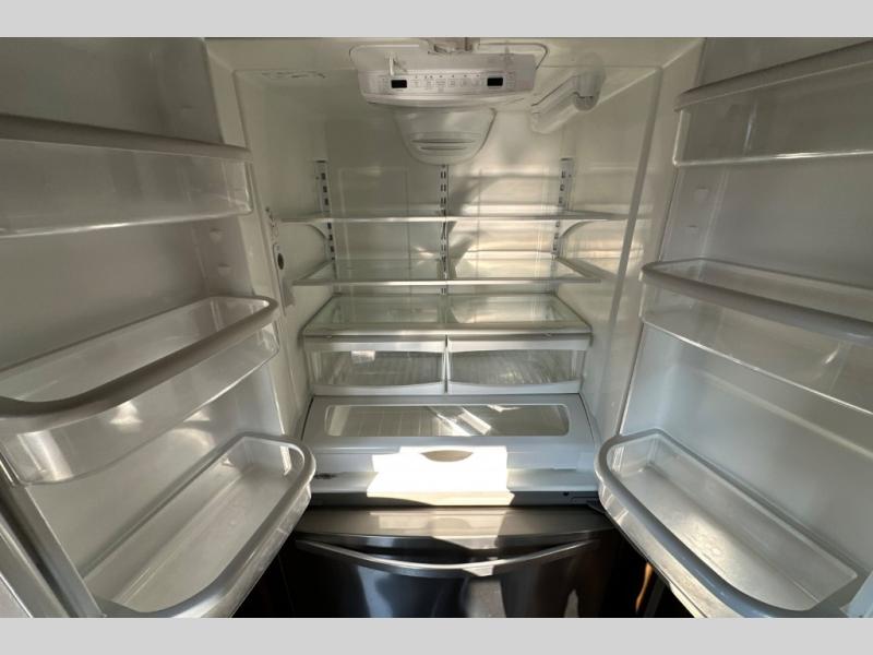 The private front bedroom offers a queen bed slide out with a shelf on either side, or you can choose an optional king size bed if you need a bit more sleeping space. There is also a dresser opposite of the bed along the curb side wall, and a full width wardrobe with shelves and drawers for all of your storage needs. In corner of the wardrobe you will find that it has been washer/dryer prepped for your convenience, plus so much more.