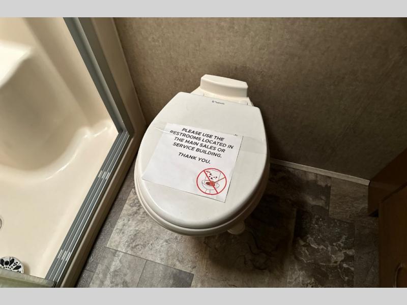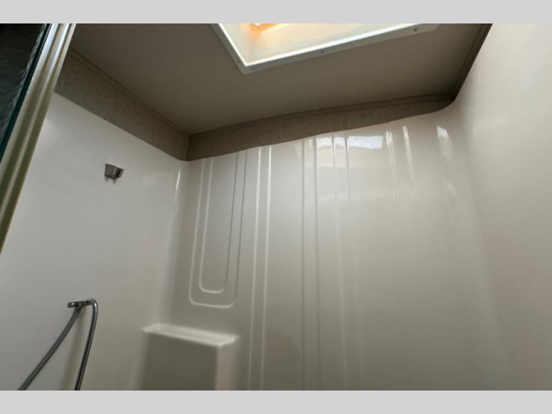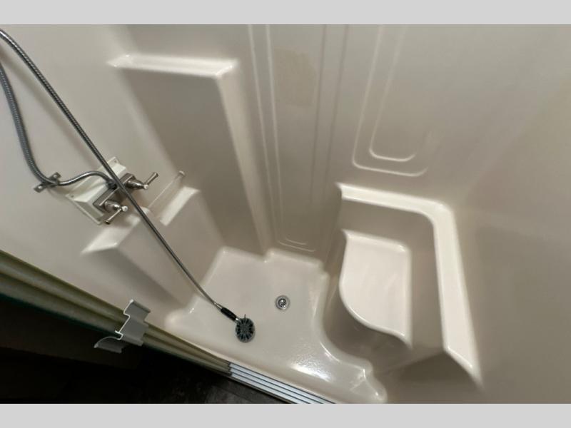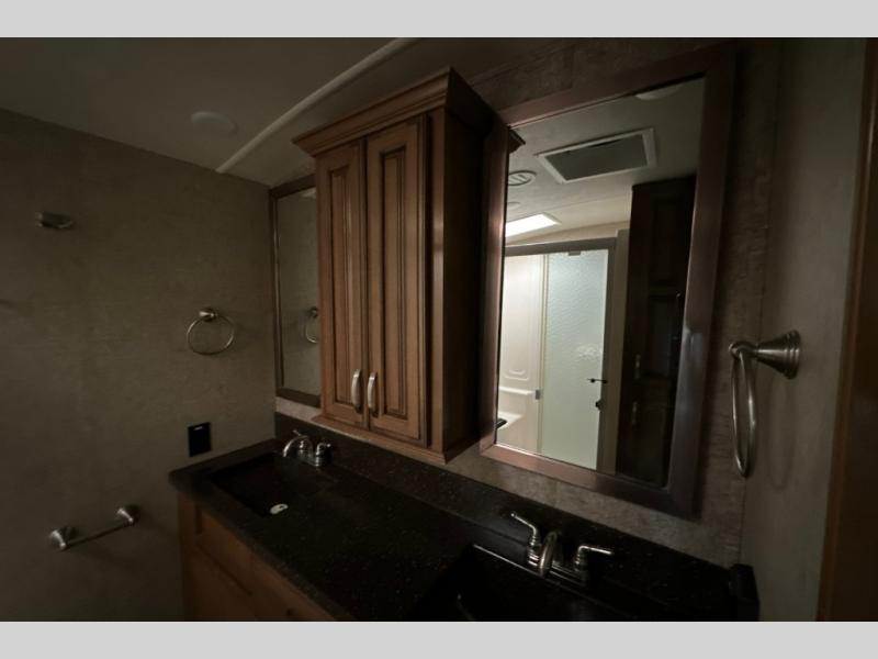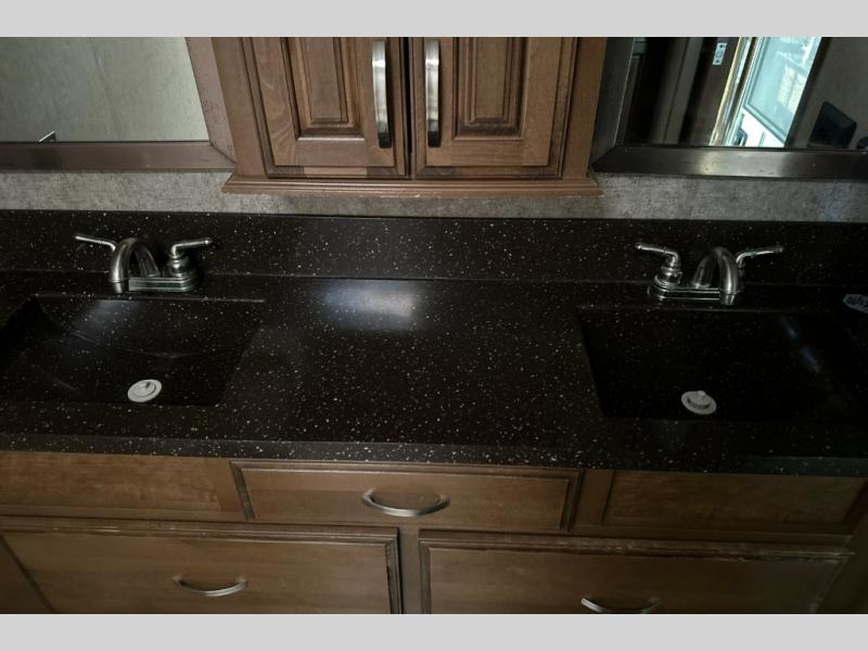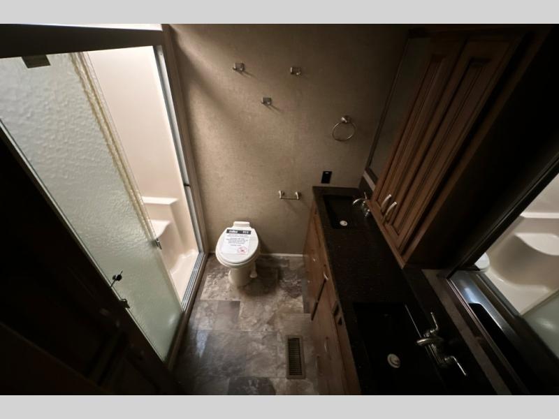 Up the steps towards the front of the fifth wheel find a full bathroom on your left. It includes a vanity with two sinks, a medicine cabinet, a nice size shower with seat, toilet, and overhead cabinet.