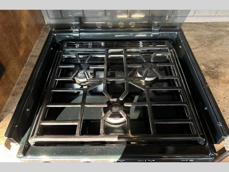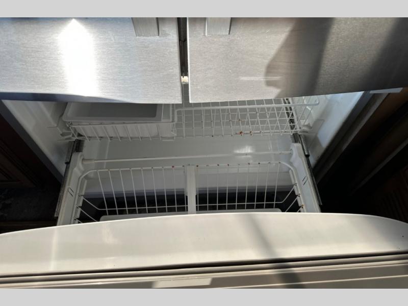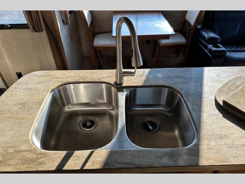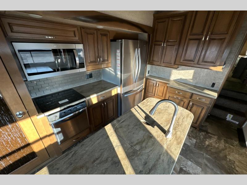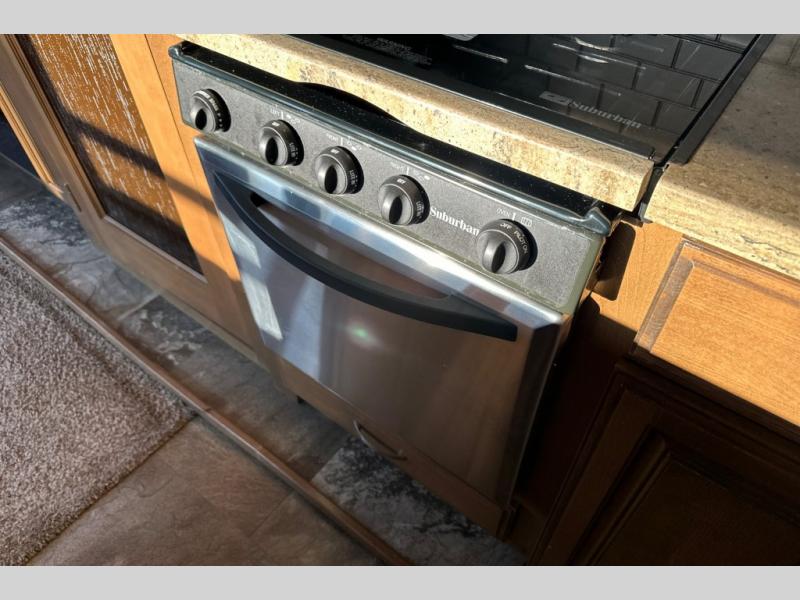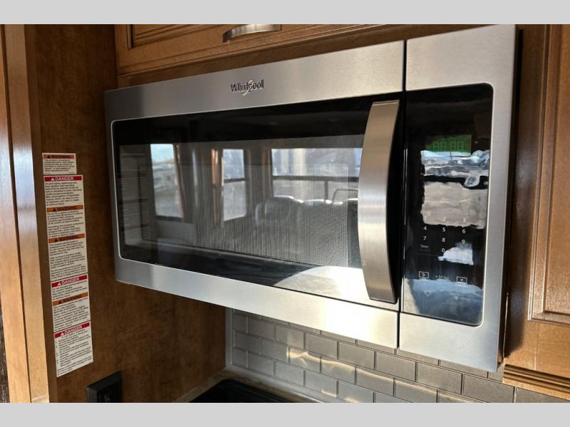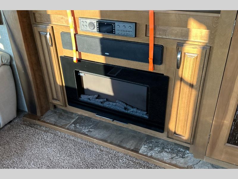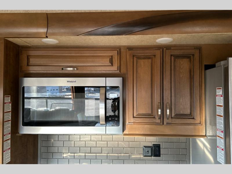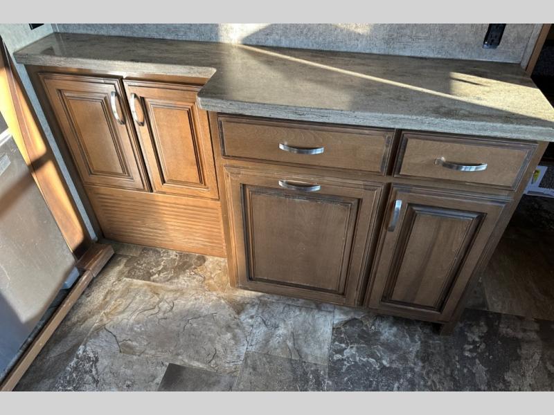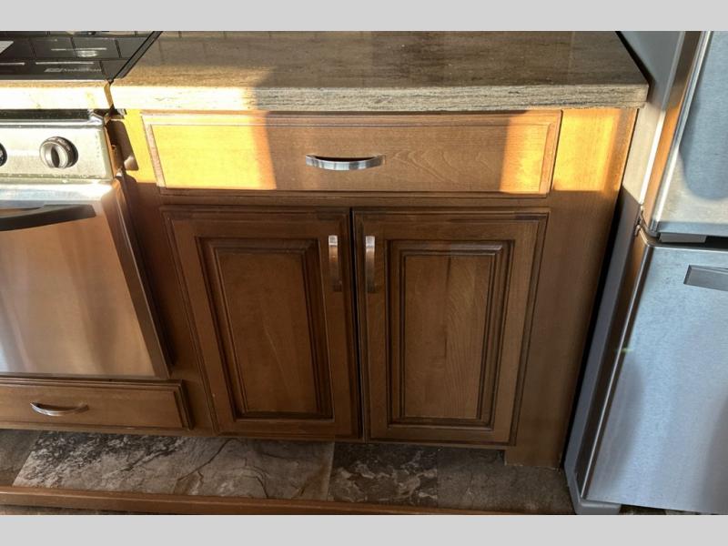 Two generous slide outs are located in the main living/kitchen area right inside the door. To your immediate left as you step inside find a slide out which offers a free standing dinette and two chairs, plus two lounge chairs. Along the rear wall you will find a sofa, plus overhead cabinets that run the entire width of the unit. Continuing around to the road side, another slide out features a fireplace and an entertainment center. This slide also features the kitchen appliances.