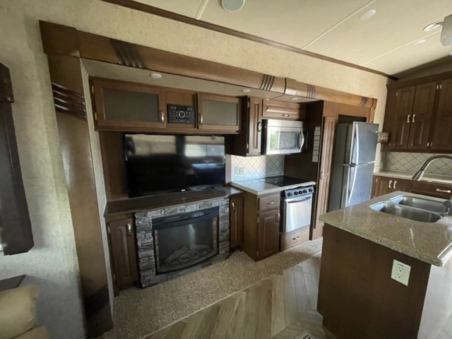 Step inside and see how much space there is to enjoy with dual opposing slides in the main living and kitchen area. To the left of the entrance there is a slide with a free-standing dinette and four chairs. Along the rear wall you will find a sofa with end tables on either side, plus more storage overhead. There is another slide with a TV, fireplace, and the kitchen appliances that includes a three burner range, microwave, pantry, and refrigerator. Along the front wall of the kitchen area you will find extra counter space and a closet. The island also offers added counter space, which you are sure to enjoy for meal prep, as well as a double kitchen sink.