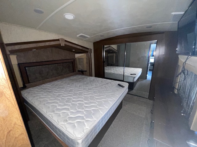In the front bedroom there is a queen bed slide, or you can choose an optional king if you wish. This slide features a cathedral ceiling like the curb side slide in the main living area. Across from the bed there is a dresser with TV, and along the front wall you have plenty of storage with a full wardrobe. The wardrobe is even prepped for a stackable washer/dryer, and there are shelves on one side and drawers on the other, plus so much more!
