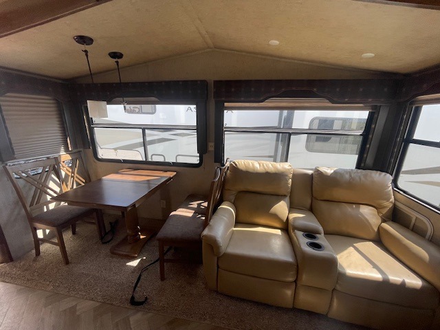 As you look at the Cedar Creek Silverback 33IK fifth wheel by Forest River you will notice that this fifth wheel has triple slides and a kitchen island.