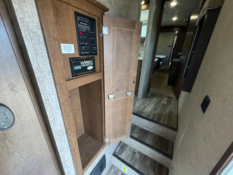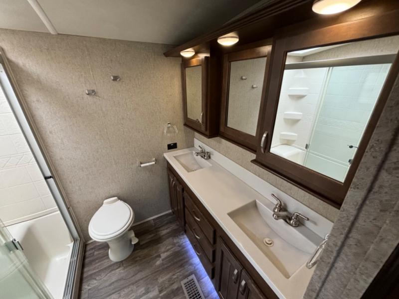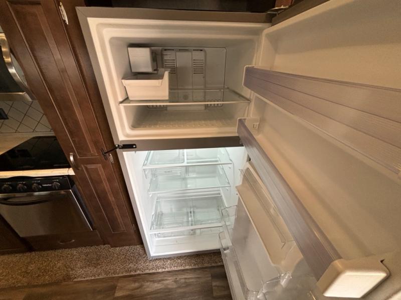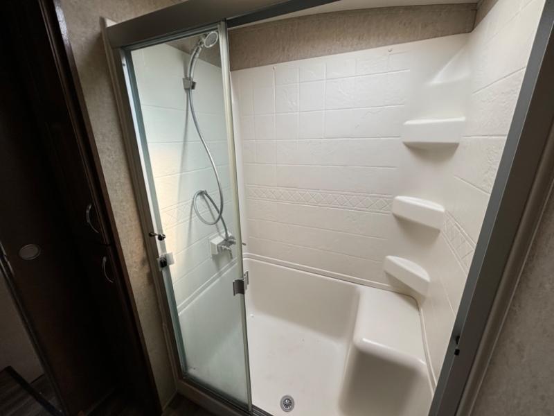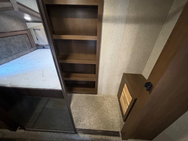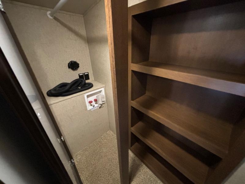 Continue toward the front where you will find the perfect spot to unwind, and sleep comfortably. You will enjoy the added space thanks to a slide out queen or optional king size bed. Like the living space this slide features cathedral ceiling styling. There is a dresser for your clothing opposite the bed, and a full front wardrobe with drawers, shelves, and a place for all of your hanging clothing. You will even find that it has been prepped for a stackable washer and dryer if you choose to add, plus so much more!