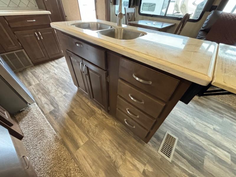 As you enter you will be impressed by the floor space in this unit. There are dual opposing slides in this space alone with a free standing dinette and two lounge chairs to your immediate left. Across the back of the unit you will find a sofa with end tables, and overhead storage the entire width. All of this seating, whether for dining or just hanging out visiting and watching TV, creates a comfortable environment for everyone camping.