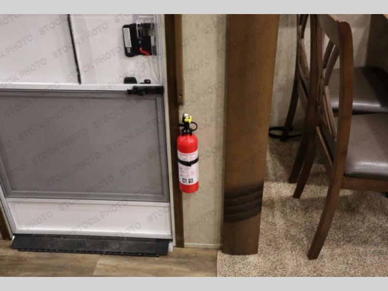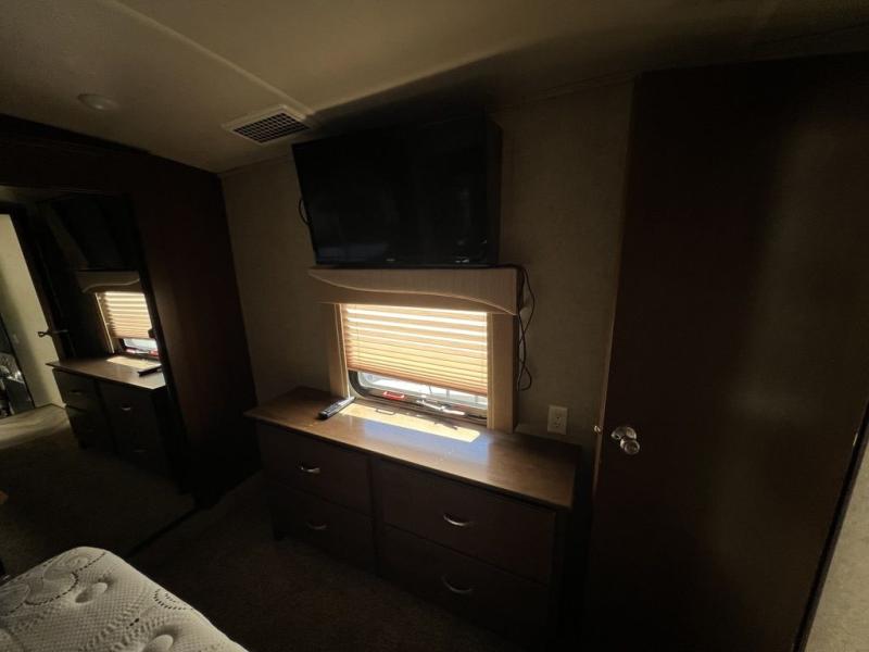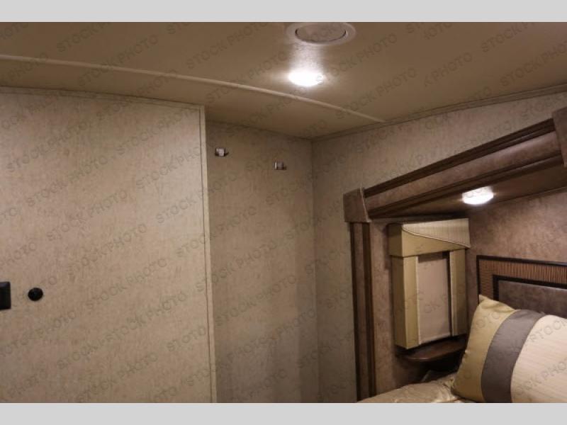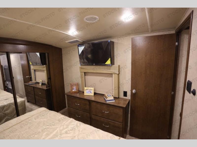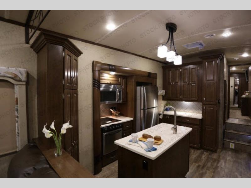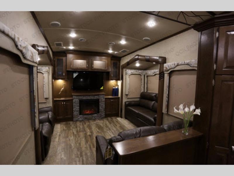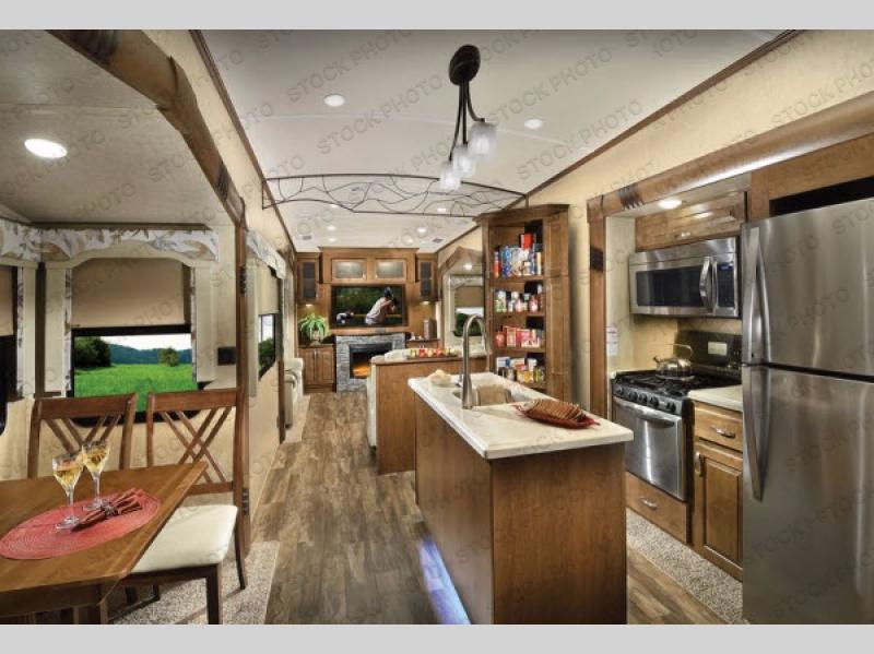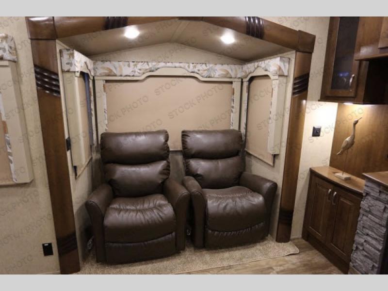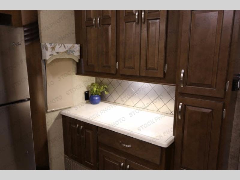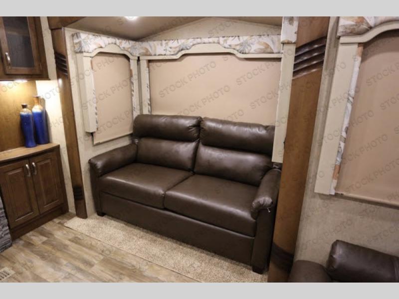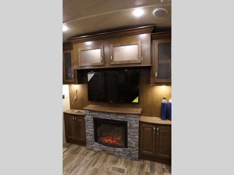 The rear living area has two opposing slides. The first has two lounge chairs, while the slide opposite has a sofa with an overhead cabinet. Also find more seating at the love seat, and there is an end table along one side of the love seat. Along the rear wall you are sure to enjoy the entertainment center with fireplace below.