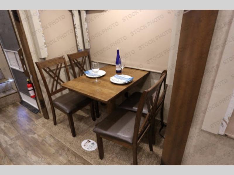 In the kitchen area there is a slide with a free-standing table and four chairs. The slide opposite has a three burner range, microwave, and refrigerator. Adjacent to the slide find a corner pantry for your canned and dry goods. With extra counter space, food prep is a breeze. Located in the middle of the kitchen is an island with a double kitchen sink, and straight in from the entry door find a handy closet.