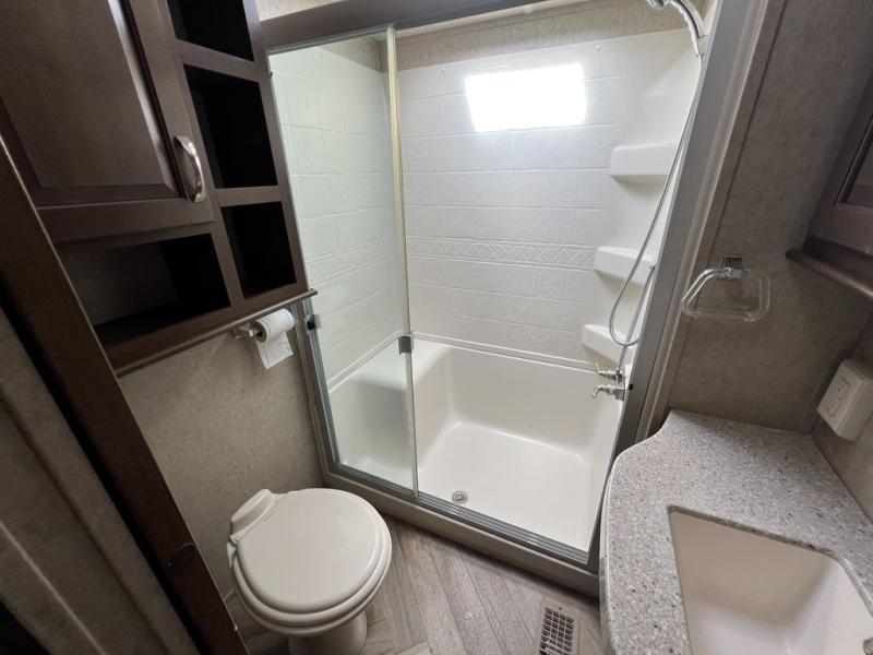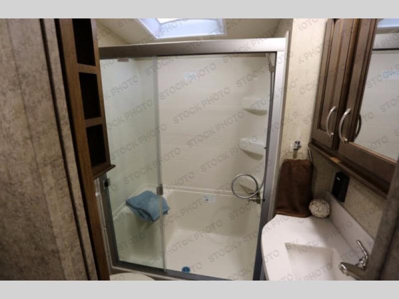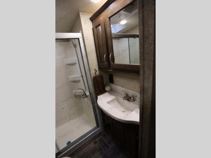 Proceed toward the front of the fifth wheel, and head up the stairs. In the bathroom you will find a linen cabinet, toilet, shower with seat, sink, and medicine cabinet.