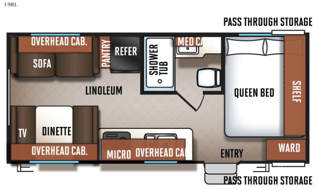 Throughout the trailer you will find many overhead cabinets as well as outside there is a large pass through storage area under the front bedroom, and much more.
