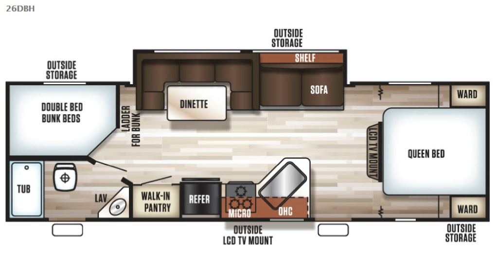 Throughout the travel trailer there are overhead cabinets as well as outside storage, an outside LCD TV mount, plus much more.