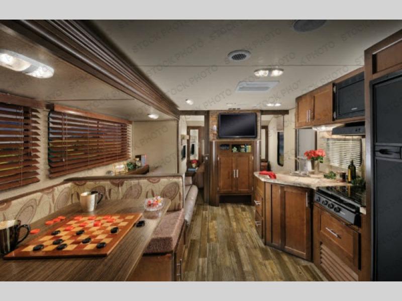 The living area offers a slide with a u-dinette and sofa. Along the front there is a LCD TV mount. The kitchen has a large sink, three burner range, microwave, refrigerator, and large walk-in pantry.