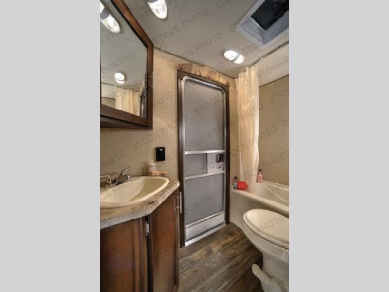 The bathroom is located in the rear of the travel trailer. There is a sink, toilet, and tub. You will also notice a private entrance from the bathroom to outside.