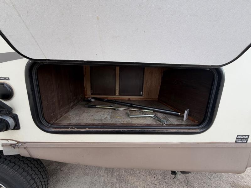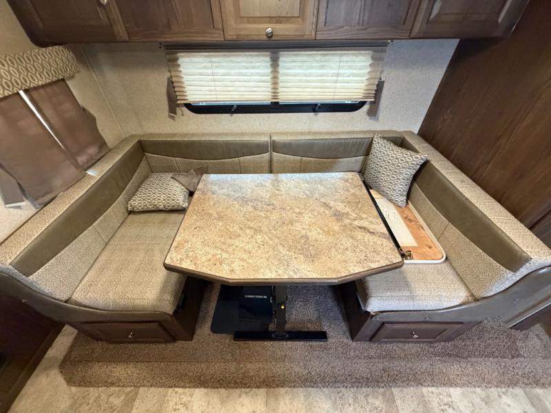 The slide out offers a u-dinette and a wardrobe. Next to the slide you will find an entertainment center. The opposite side of the trailer has a counter top extension, double kitchen sink, three burner range, microwave, pantry, and refrigerator.