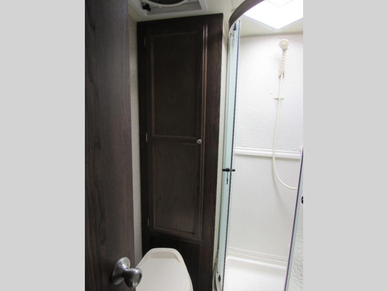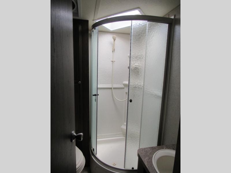 Step inside and find a refrigerator to the left, and on the wall outside of the bathroom there is an entertainment center which can easily be seen from the kitchen area. To the right of the entry door find a three burner range, microwave, double kitchen sink, large counter area with overhead cabinets, and a pantry. The u-dinette is on a slide and there is an overhead cabinet.