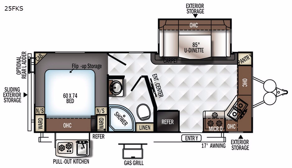 Outside fix a quick snack or dinner at the pull-out kitchen which features a two burner range, sink, and refrigerator. You will also find a gas grill, and an optional rear ladder. Your exterior camping gear can be stored in the exterior storage area and more!