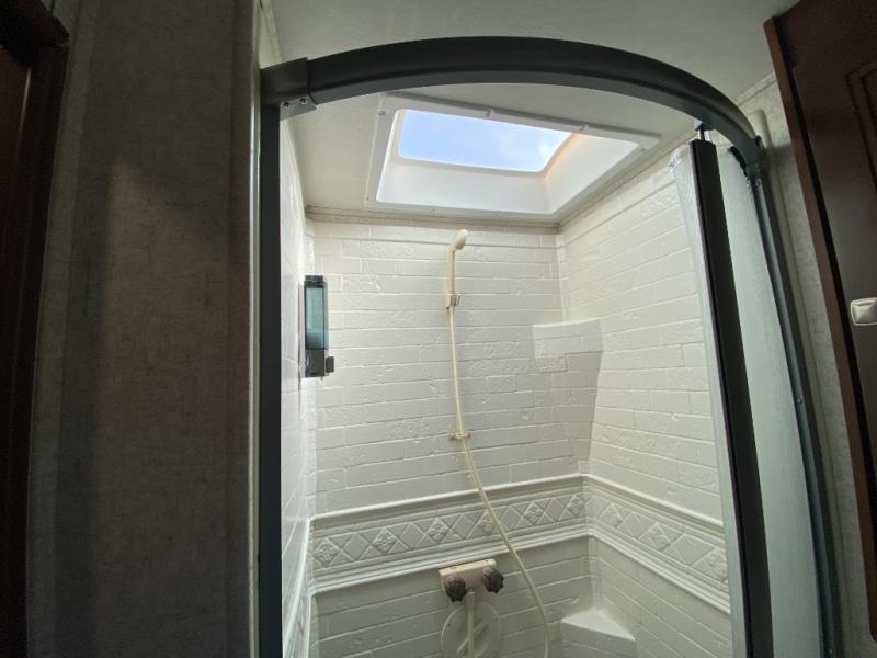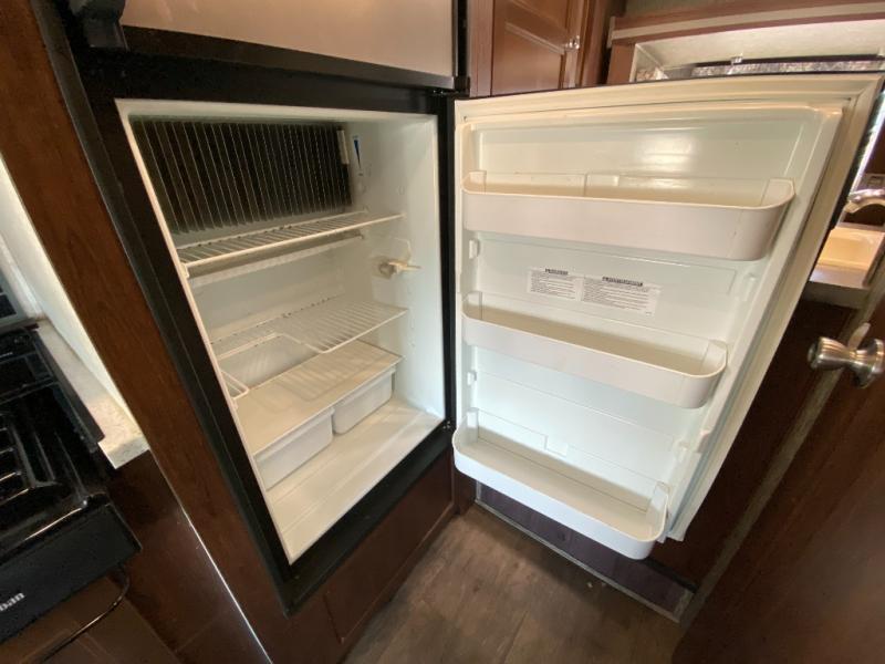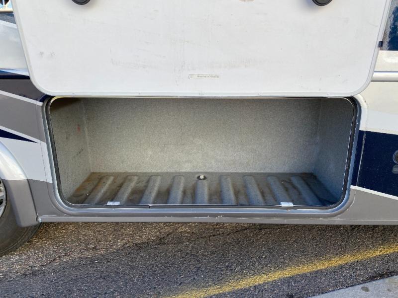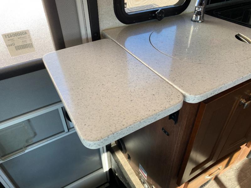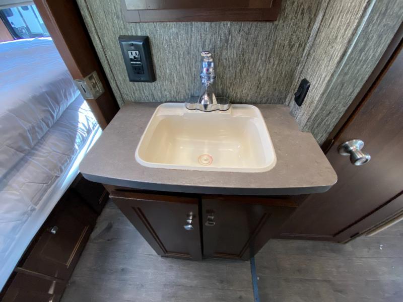 When you enter the motor home you will notice how spacious it seems with the slide out. The dinette, pantry, and wardrobe are all located within the slide. In place of the dinette there is an optional sofa with table. Along the opposite side of the motor home you will find a flip counter top, single sink, three burner range, microwave, and refrigerator. To the right of the entrance there is a LED TV.