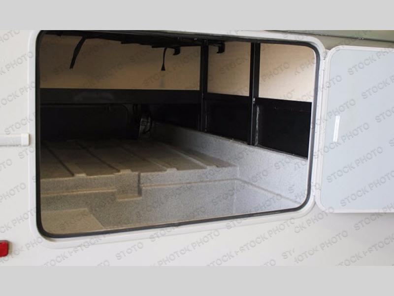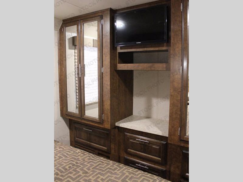 In the rear of the motor home, you will find a king bed slide with overhead cabinets, plus wardrobes and a LED TV on the opposite side.