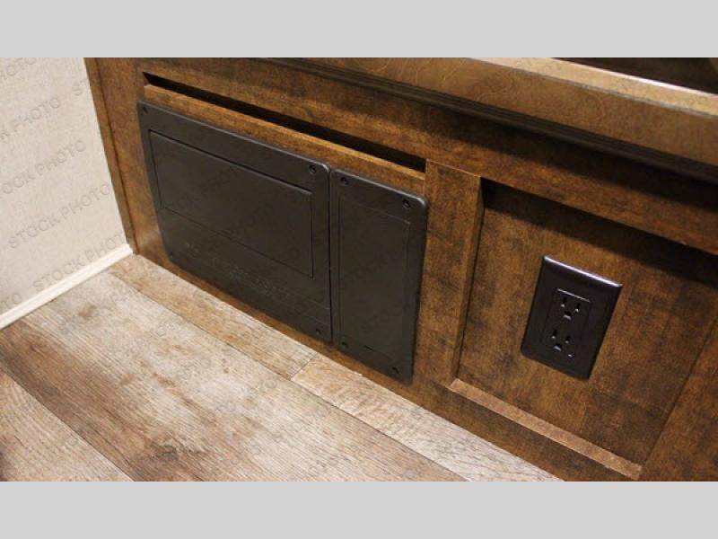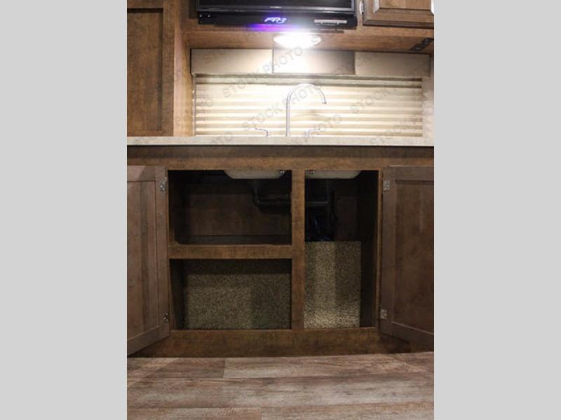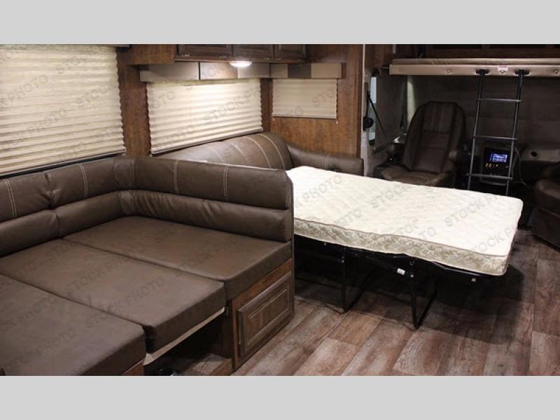 As you enter the motor home, on your left there is a double kitchen sink, 40" LED TV, countertop space, three burner range with residential microwave above, a refrigerator and pantry. You can choose an optional 18 cu. ft. refrigerator is you like. The opposite side offers a slide out hide-a-bed sofa with footrests and a wrap-around booth dinette.