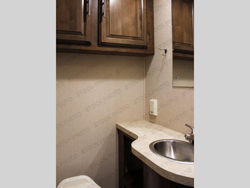 The walk-thru bathroom includes a private toilet area with a vanity sink on one side of the motor home, and a shower on the other side. You can choose to close the sliding doors for privacy for a full bath.