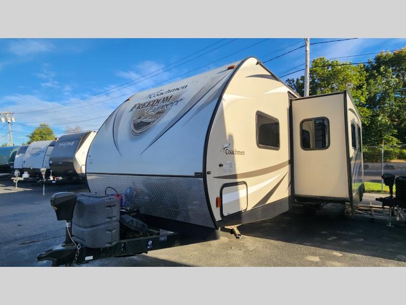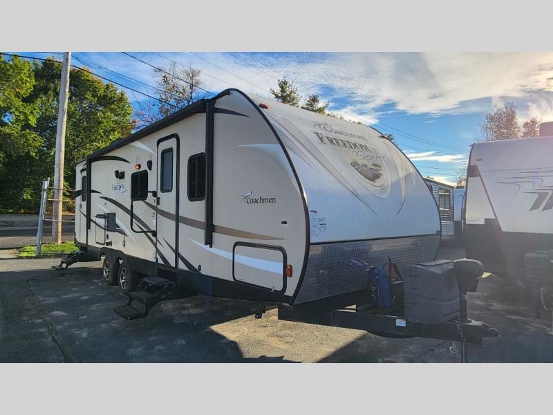 Family-friendly, lightweight, and packed with features—the 2017 Coachmen Freedom Express 282BHDS is the ideal travel trailer for campers who want maximum comfort and versatility at a great value. This popular bunkhouse model sleeps up to 8 and includes a large slide-out, private master bedroom, dual entry doors, and an outdoor kitchen—all in a half-ton towable package.