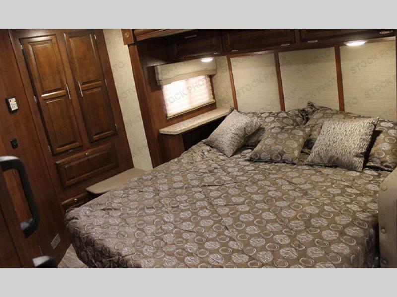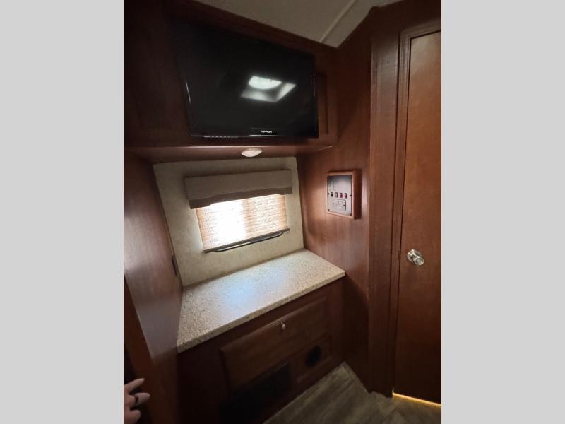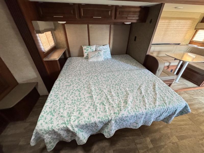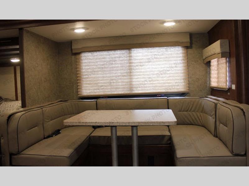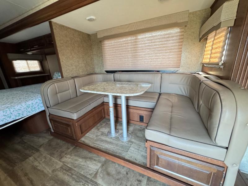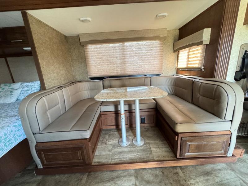 Step inside just behind the front passenger seat and notice how open the floor space is thanks to the large road side slide. Here you will find a slide out u-shaped dinette for meal times and relaxing, and a king size bed including one nightstand at the end of the day for a great night's rest. There is a TV on the opposite side of the u-dinette.