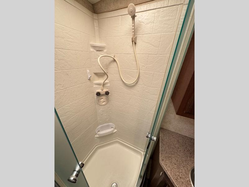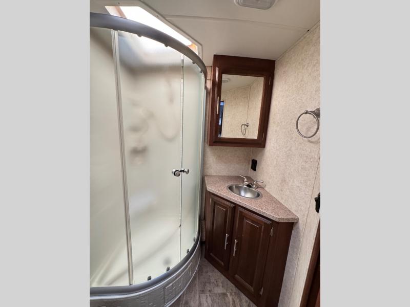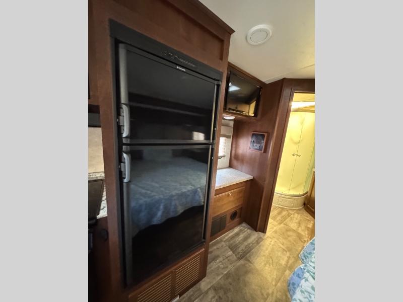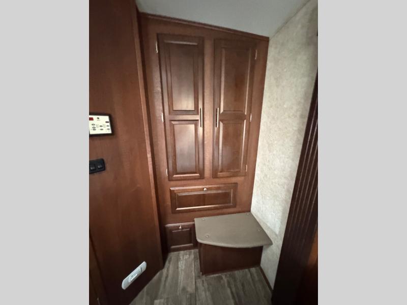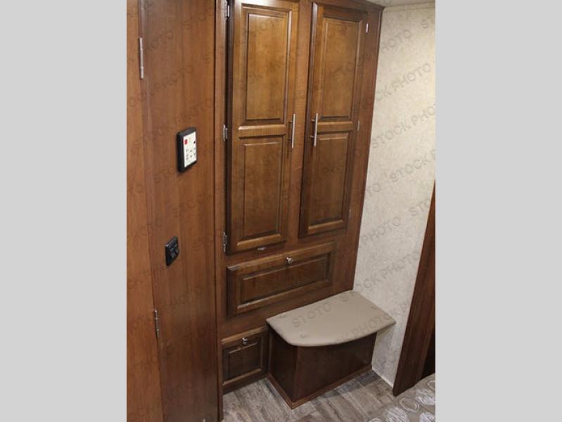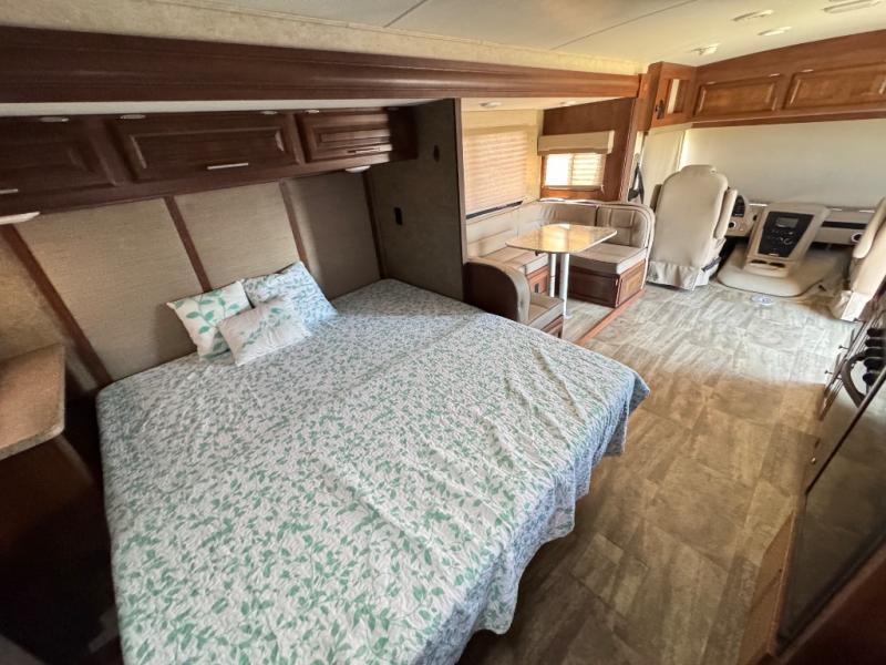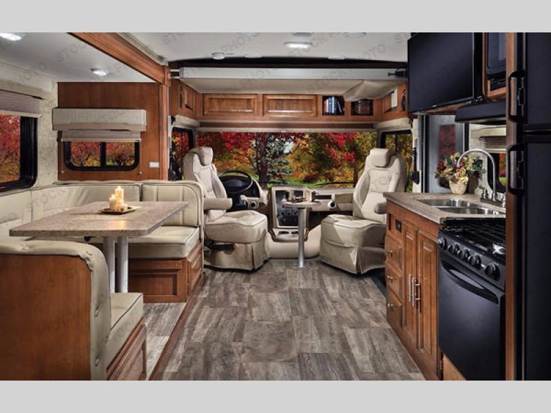 Step inside just behind the front passenger seat and notice how open the floor space is thanks to the large road side slide. Here you will find a slide out u-shaped dinette for meal times and relaxing, and a king size bed including one nightstand at the end of the day for a great night's rest. There is a TV on the opposite side of the u-dinette.