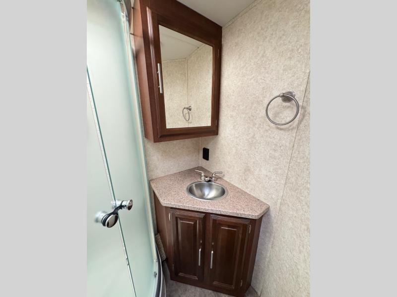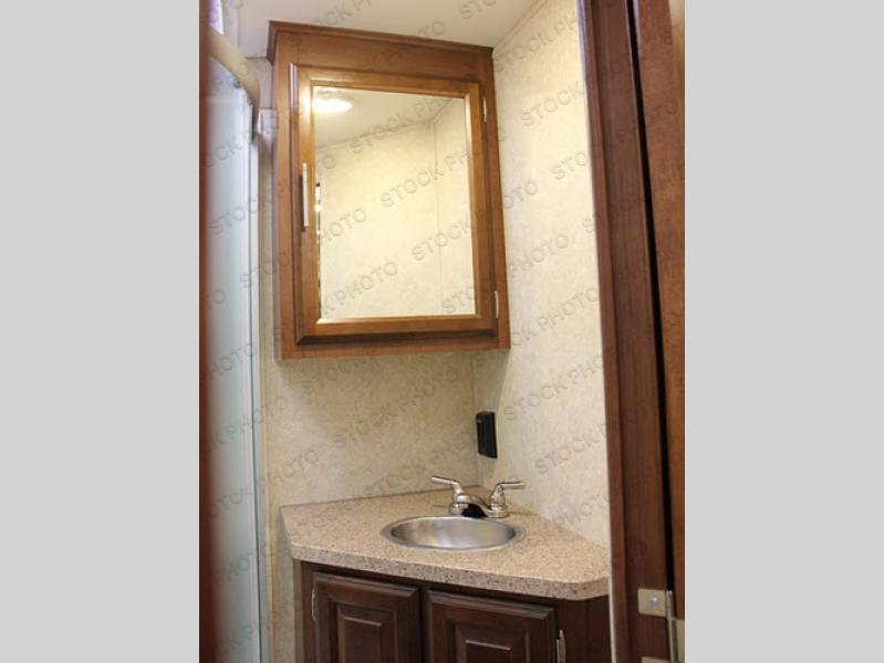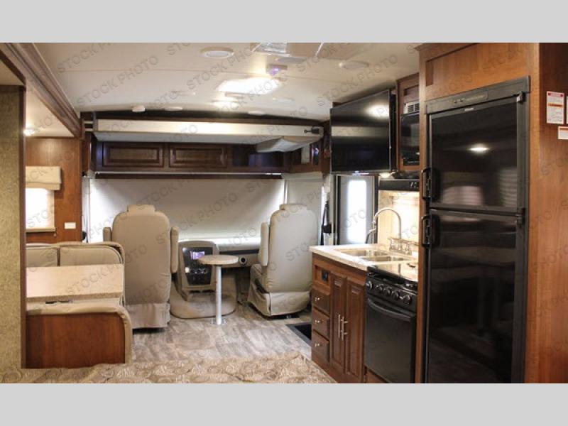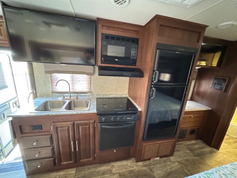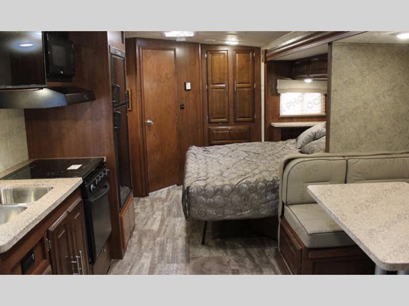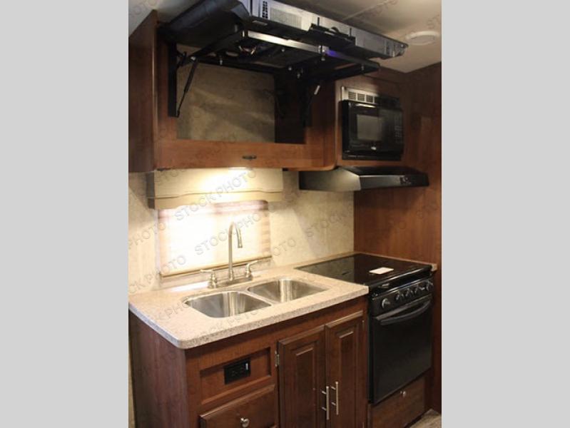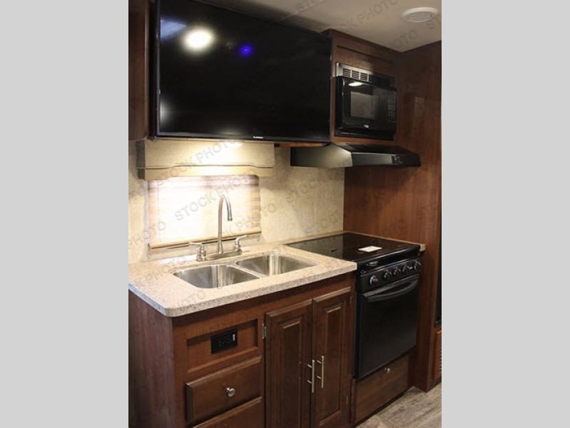 To the left of the entry door you will find a kitchen area that makes preparing and cooking food simple. There is a flip-up counter extension on the end, and a double sink for cleaning up. Next to the sink there is a three burner range with overhead microwave oven, and a refrigerator. There are also plenty of overhead storage cabinets and space for your daily dishes and things.
