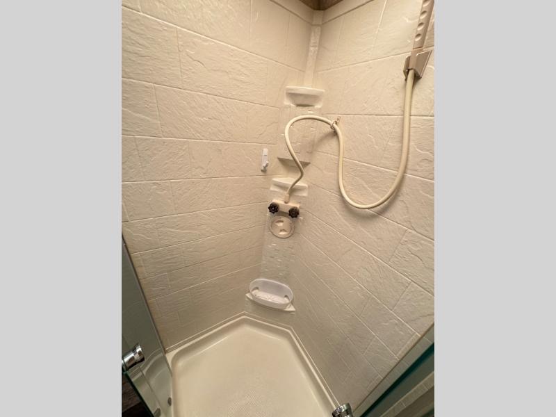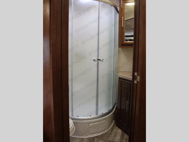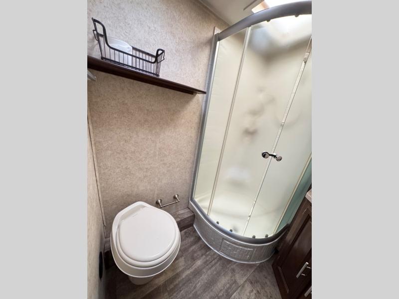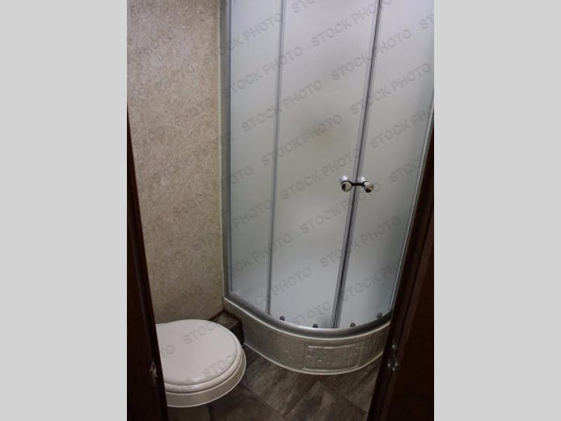 The rear left corner features a complete bath including a radius shower, toilet, and a vanity with sink, plus storage.