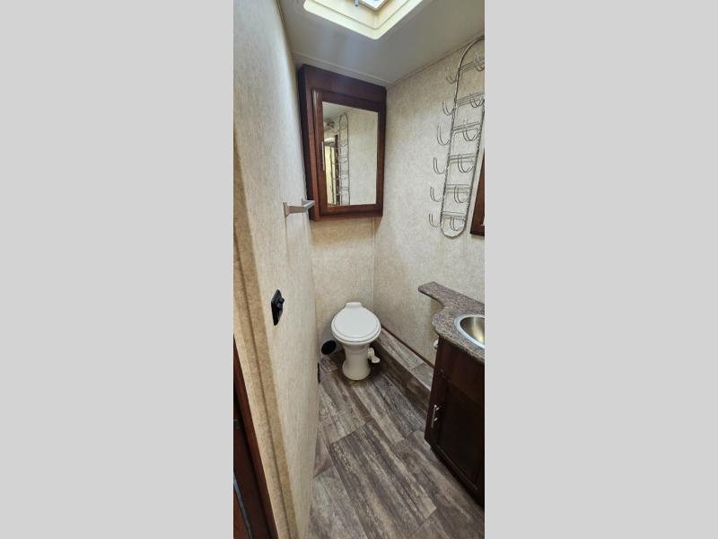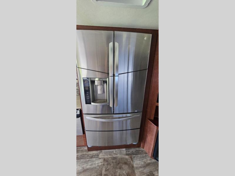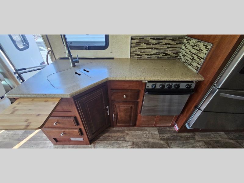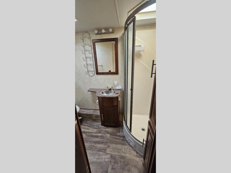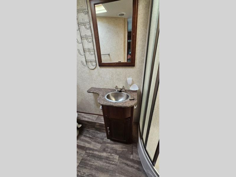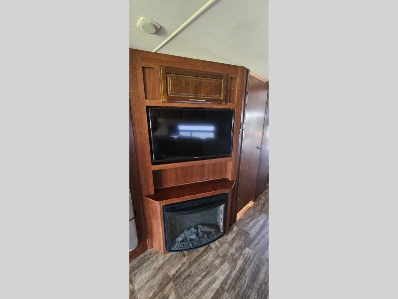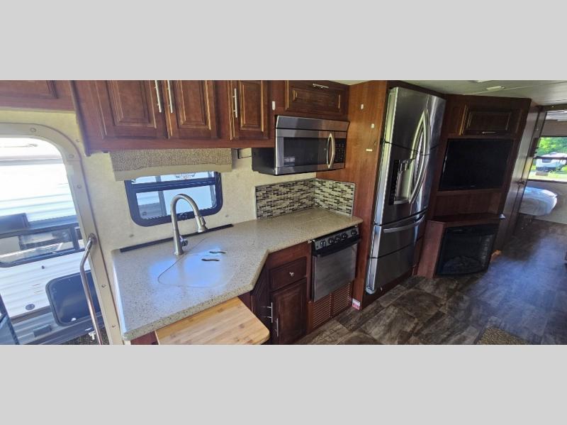 As you enter 335DS by Forest River you will see to your left, a double kitchen sink, three burner range with microwave above, a refrigerator or you can choose an optional stainless residential refrigerator, and pantry. On the opposite there is a slide out second pantry, dinette, L-shaped hide-a-bed sofa, and end table. The TV and fireplace are on the outer wall of the bath for easy viewing.