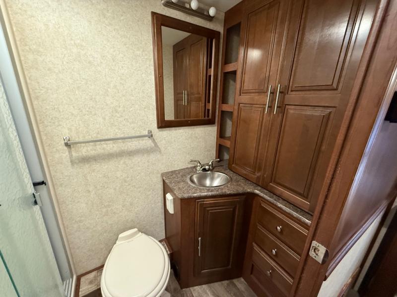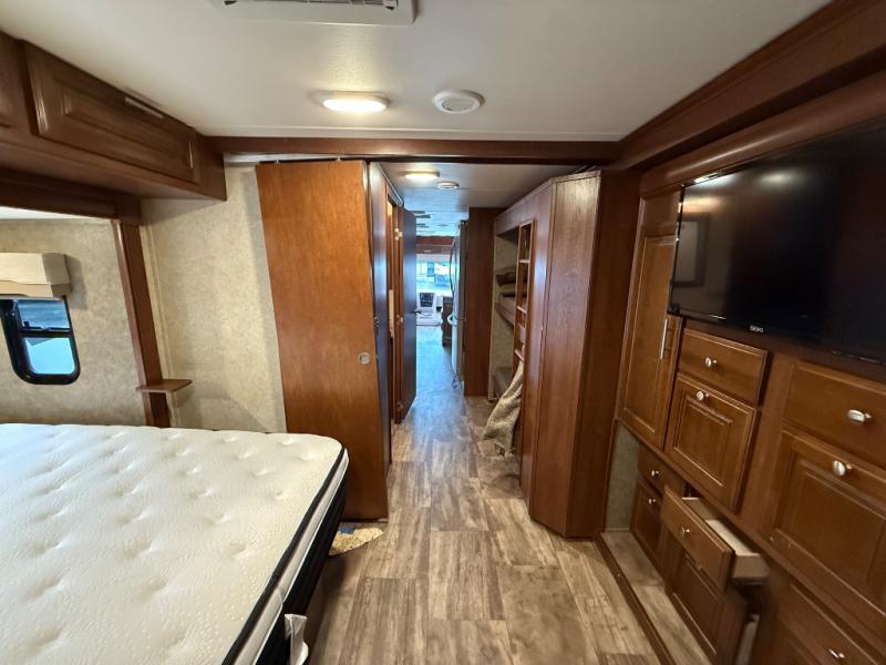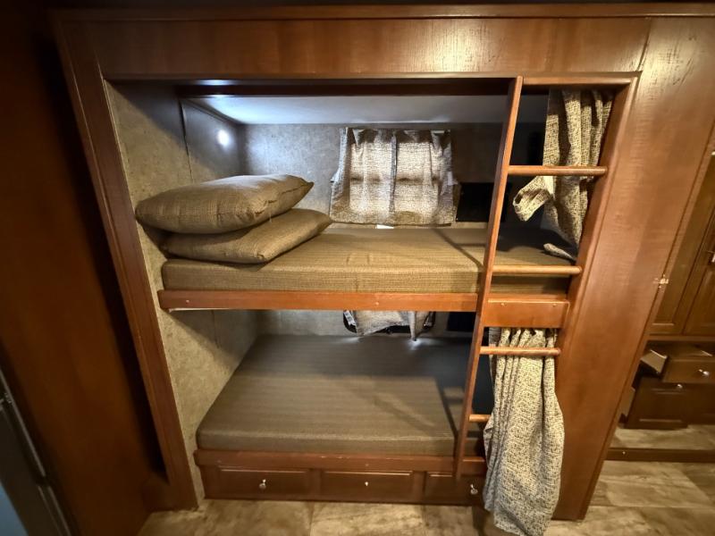 Across from the bathroom and leading into the bedroom there is a slide with a set of bunk beds, plus a large wardrobe and TV inside the bedroom. Across from the wardrobe you will find a slide out king bed with nightstands and overhead storage.